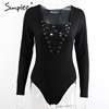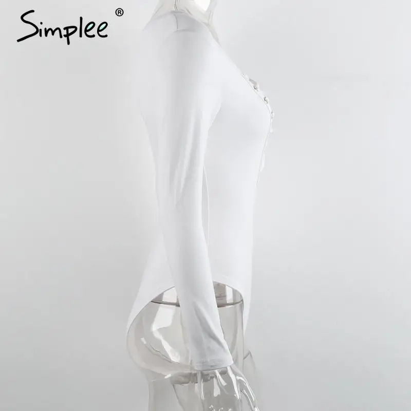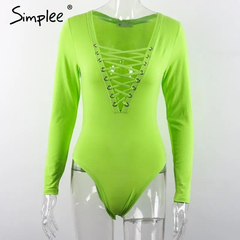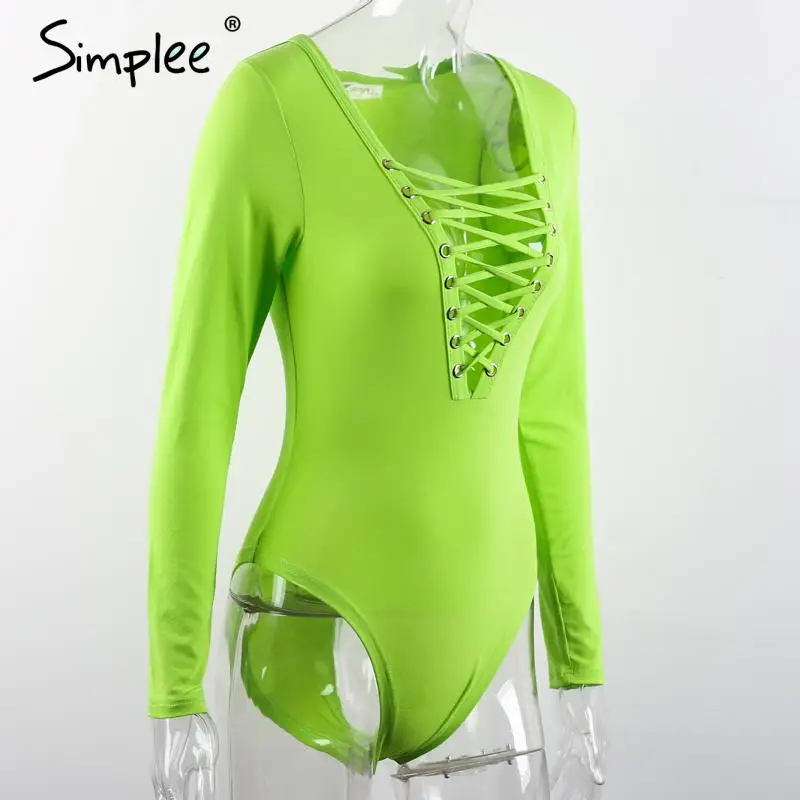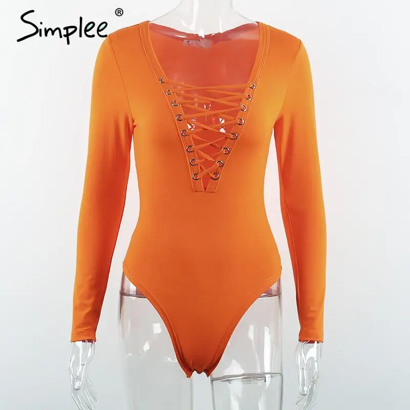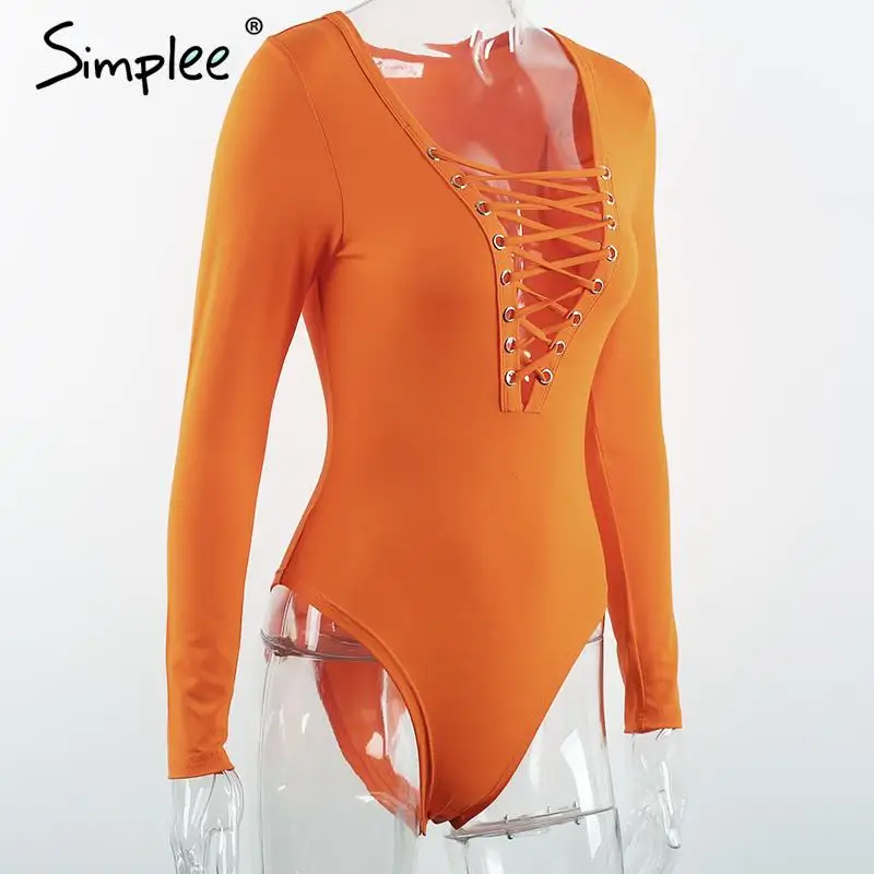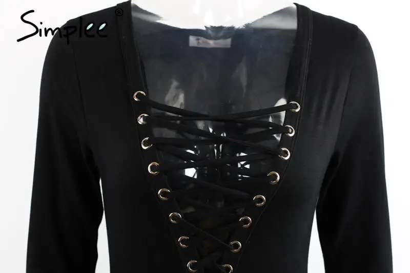 Simplee Cross lace up jumpsuit romper women Sexy v neck bandage bodysuit overalls Autumn winter knitted playsuit leotard