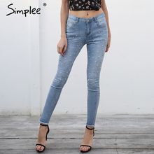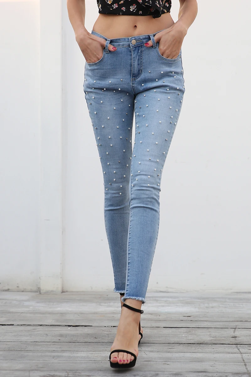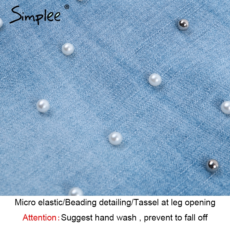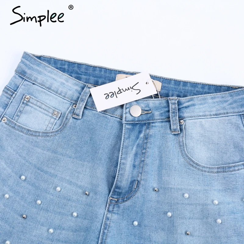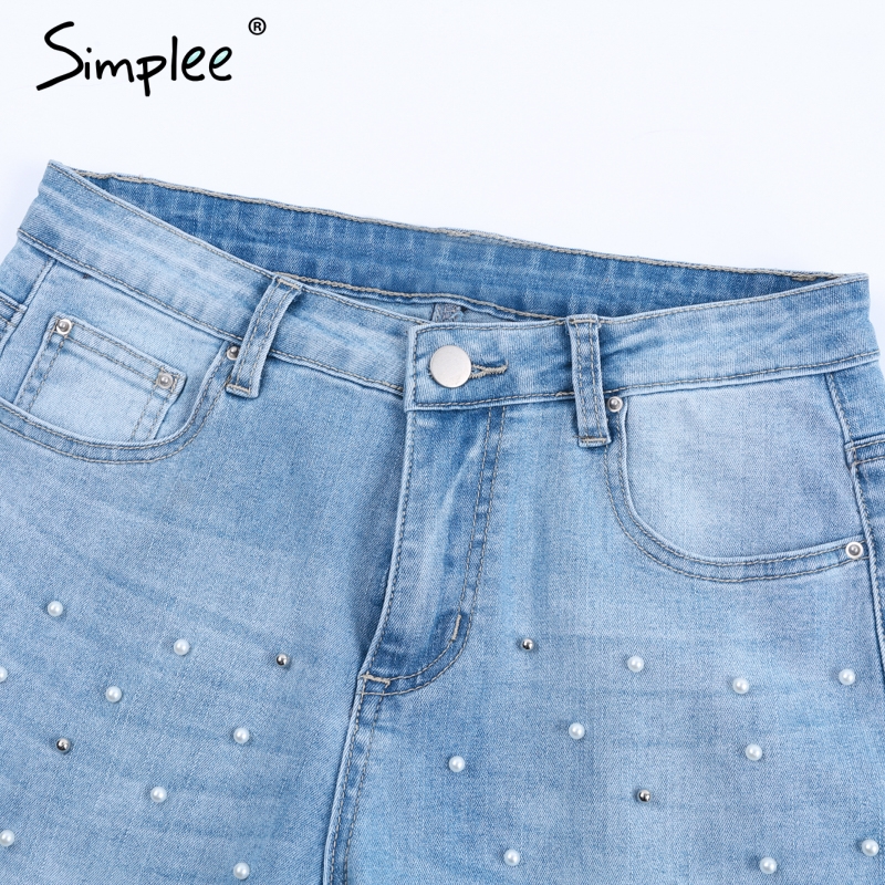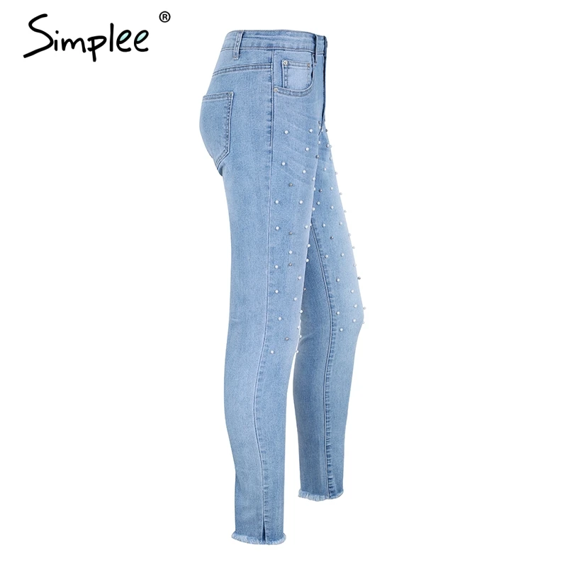 Simplee Pearl blue denim high waist jeans women Beading tassels skinny jeans streetwear pants 2018 spring pocket jeans femme