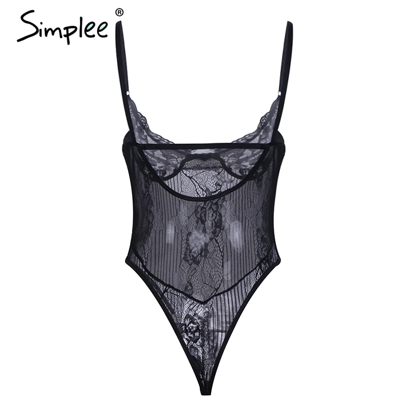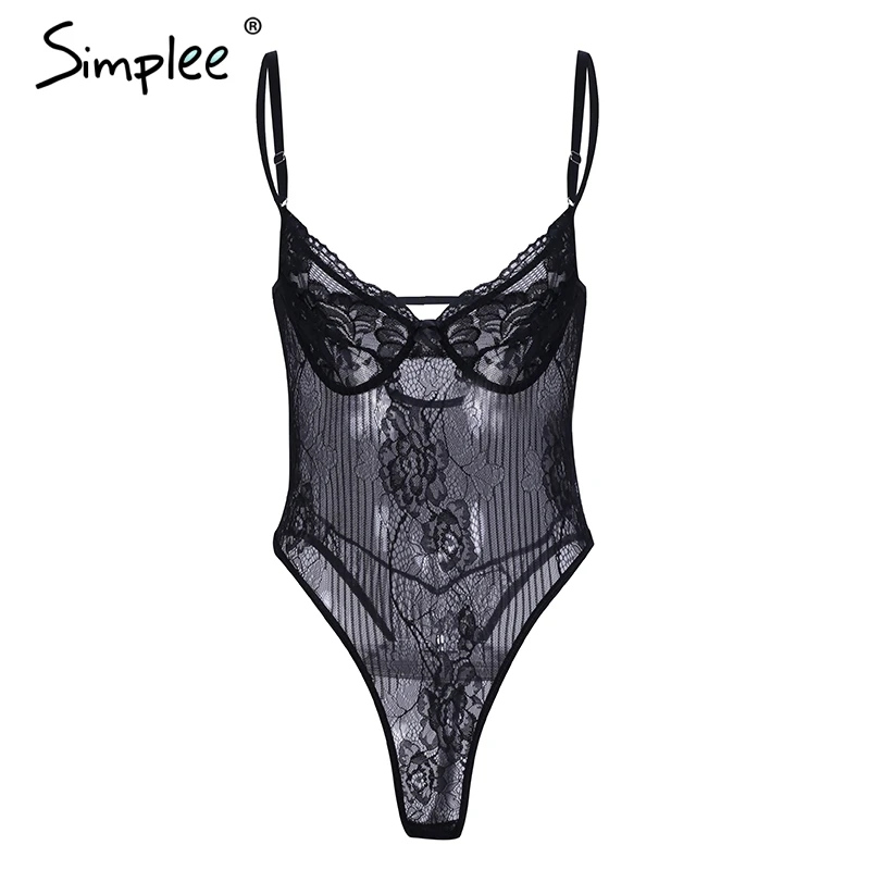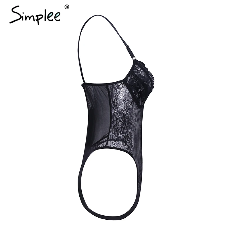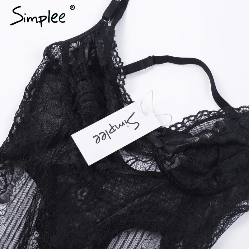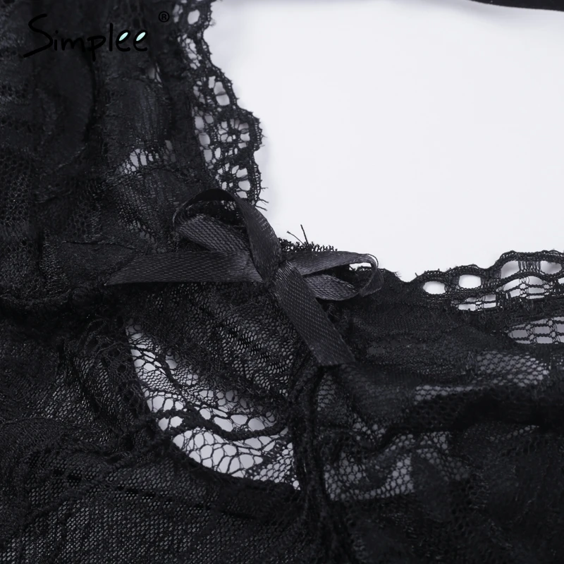 Simplee Sexy lace black bodysuit jumpsuit romper Women hollow out flower bow bodysuit Backless transparent strap slim bodysuit