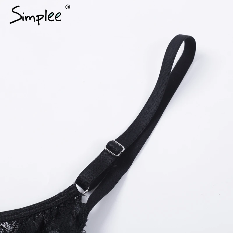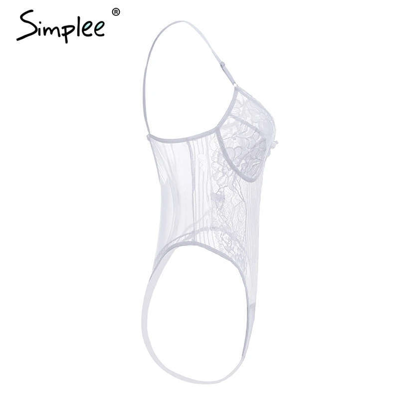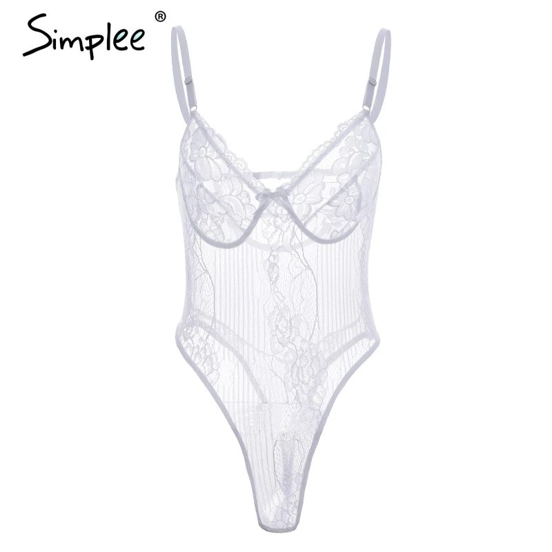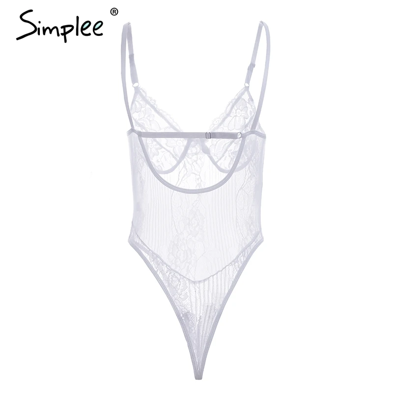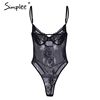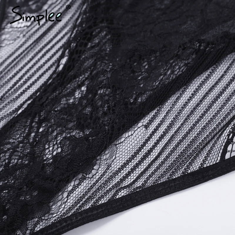 Simplee Sexy lace black bodysuit jumpsuit romper Women hollow out flower bow bodysuit Backless transparent strap slim bodysuit