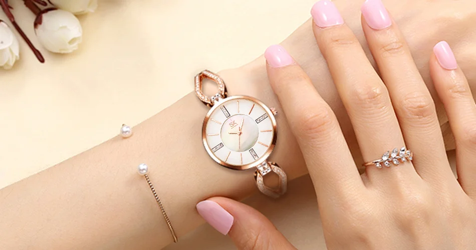 SK 20 Free Shipping Gold Luxury Brand Women Watches Elegant Diamond Dial Bracelet Dress Wristwatch For Girls Ladies Quartz Watch