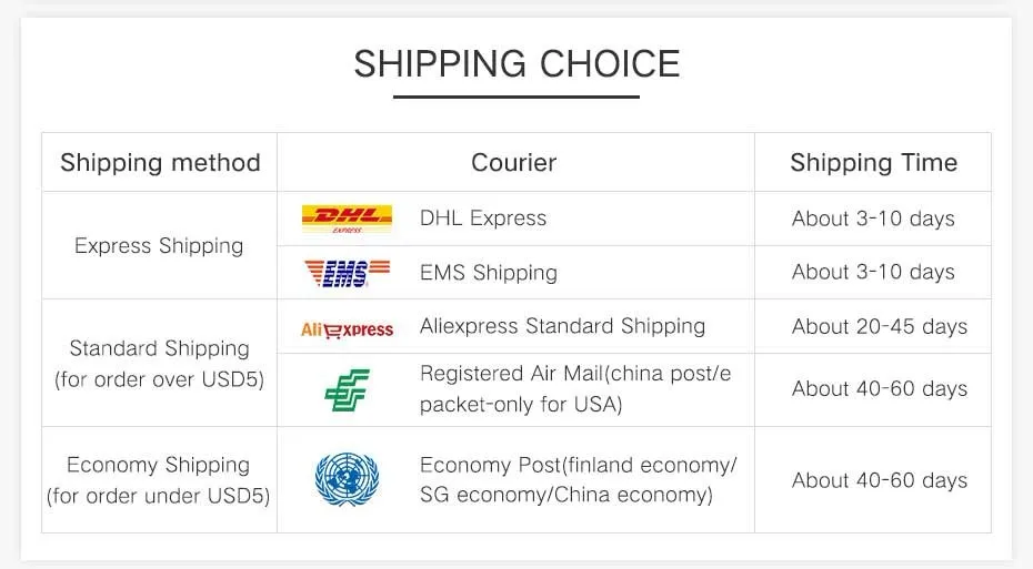 Packages from our warehouse in China will be shipped by ePacket or EMS depending on the weight and size of the product. Packages shipped from our US warehouse are shipped through USPS.