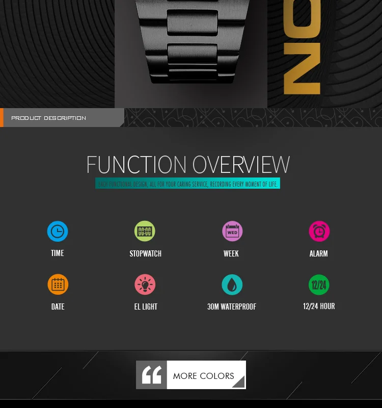 Functions: Stopwatch, Water Resistant,Alarm Clock,12/24 Hour Clock,EL Light,Date