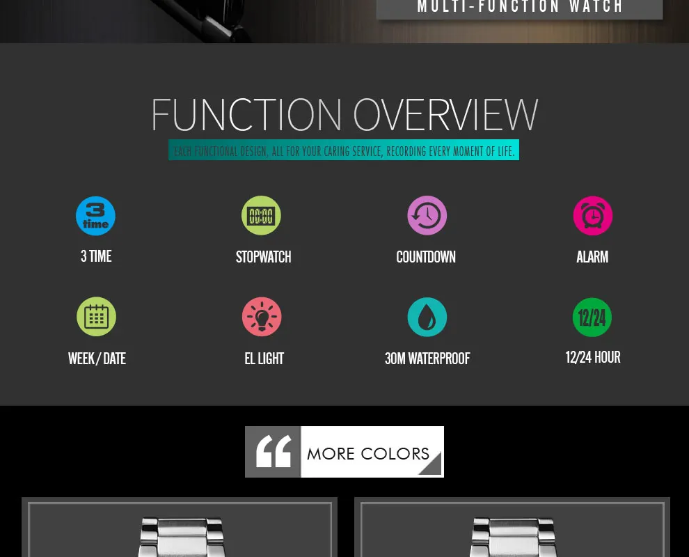Functions: 3 time,Chrono,Alarm,Date,Week,EL,Count down,12/24 hour clock