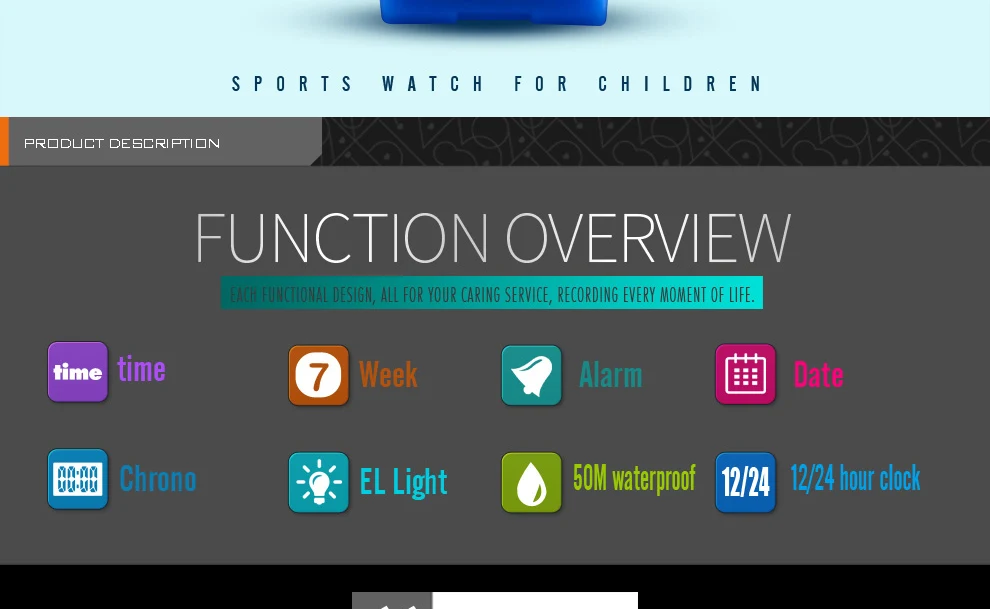 Feature: Alarm,Date,Chrono,El Light,50M Waterproof,12/24 Hour Clock,Week,Shock Resistant