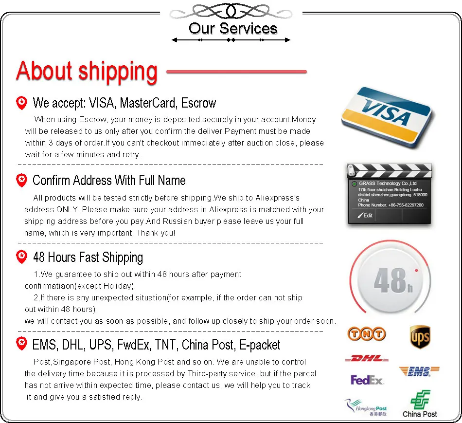 Packages from our warehouse in China will be shipped by ePacket or EMS depending on the weight and size of the product. Packages shipped from our US warehouse are shipped through USPS.