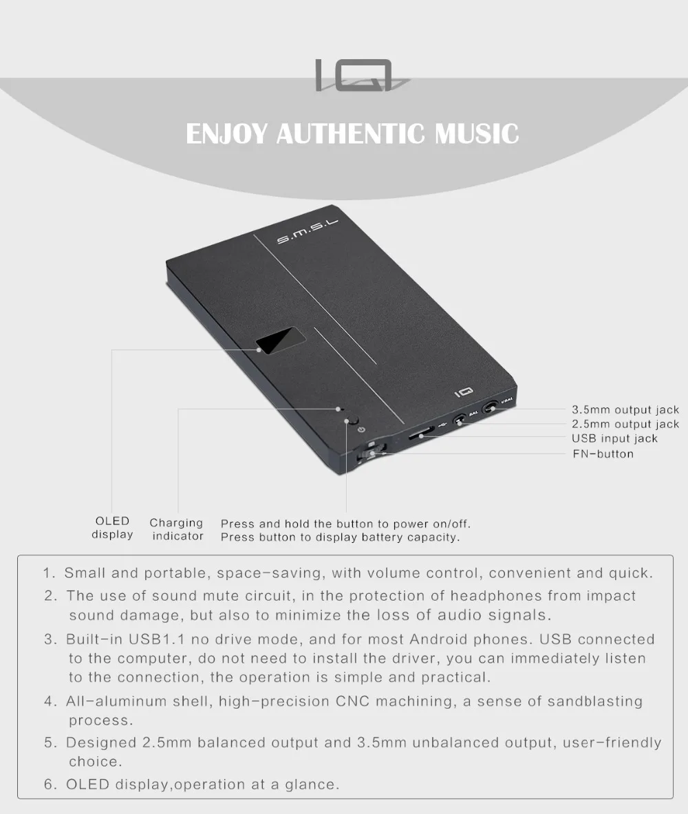 • SMSL IQ USB HI-RES Portable headphone Amplifier with DAC DSD512 built-in chargeable battery;