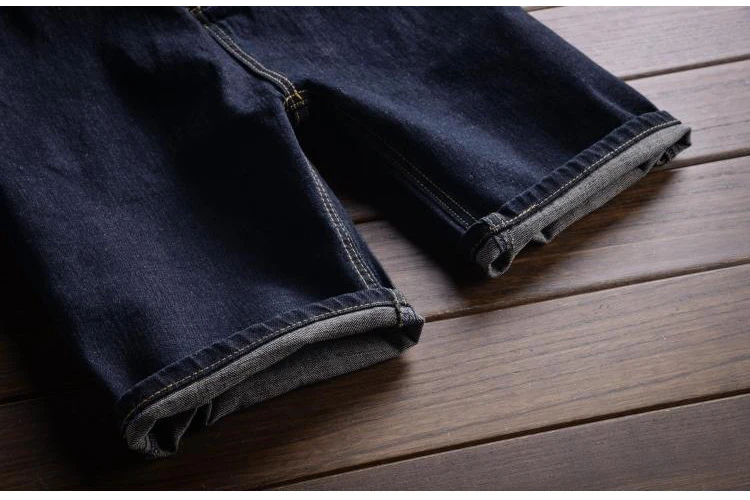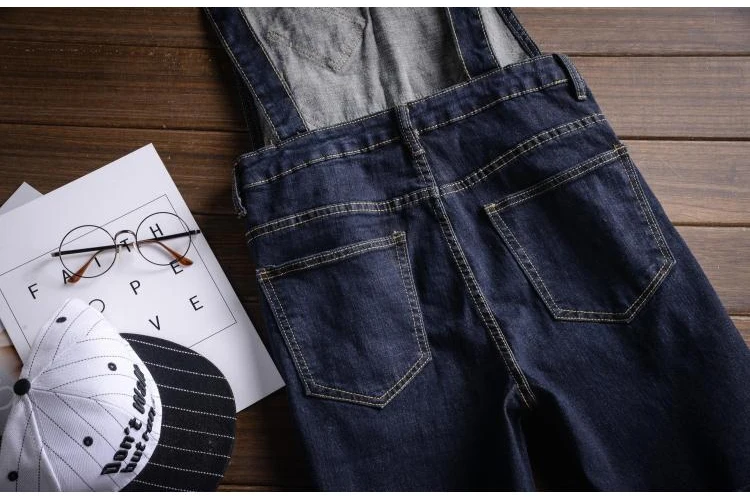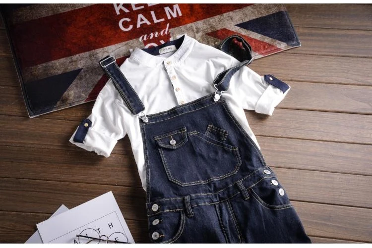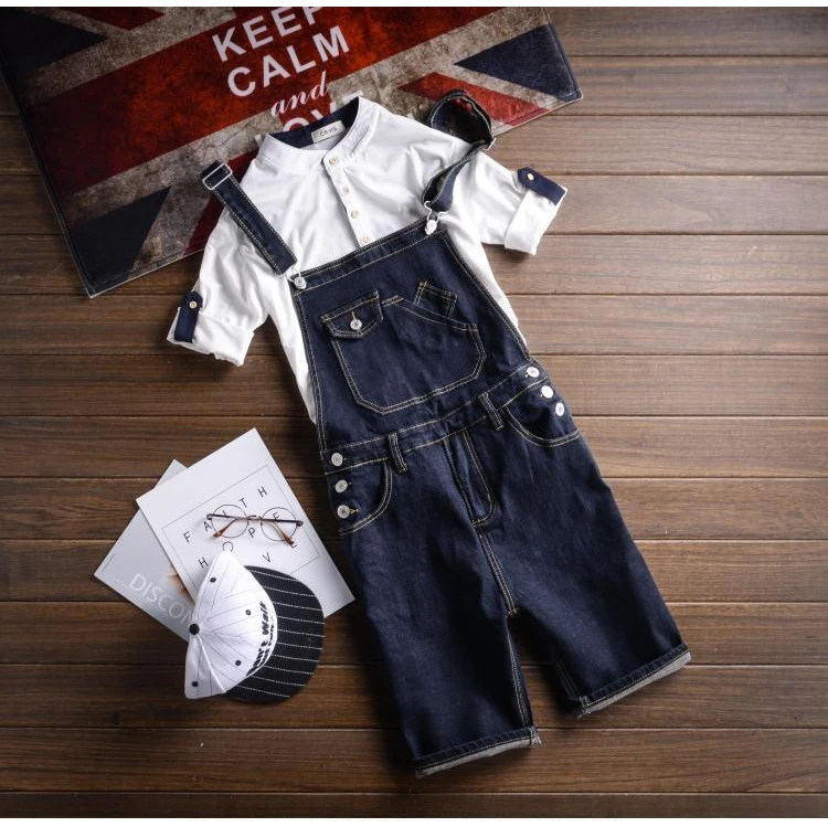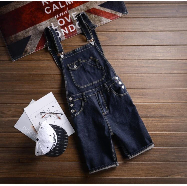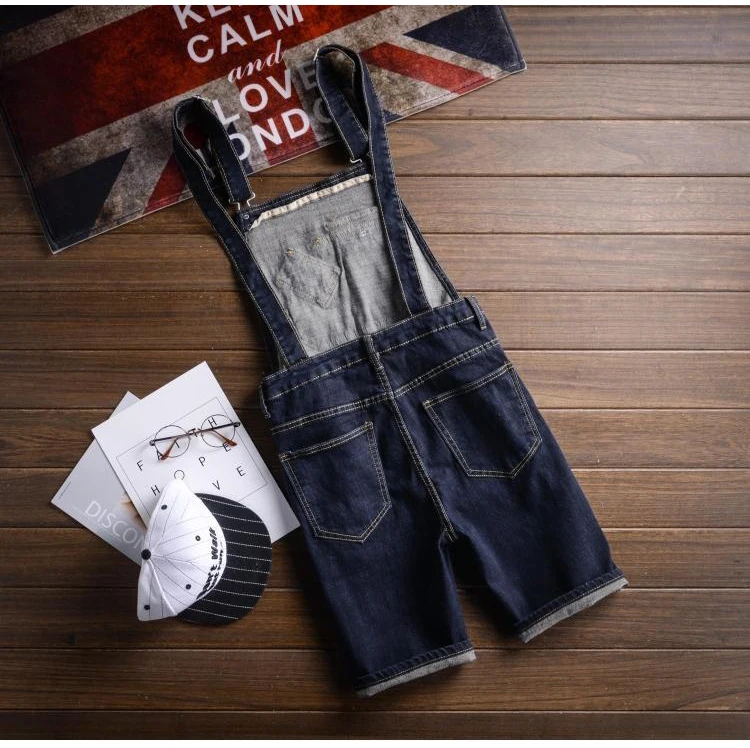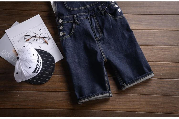 Sokotoo Men’s dark blue denim knee length bib overalls shorts Plus big size slim fit suspenders jumpsuits Boy’s jeans for summer