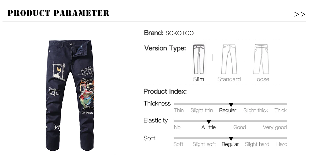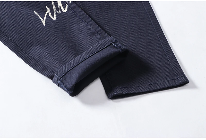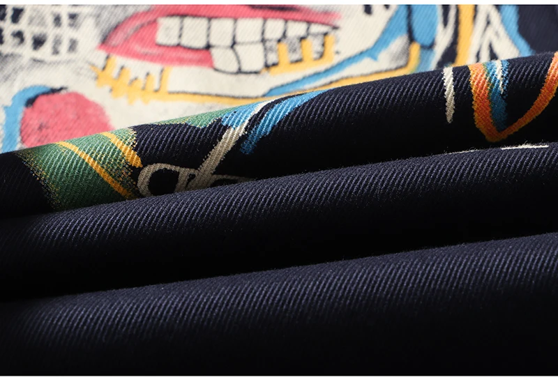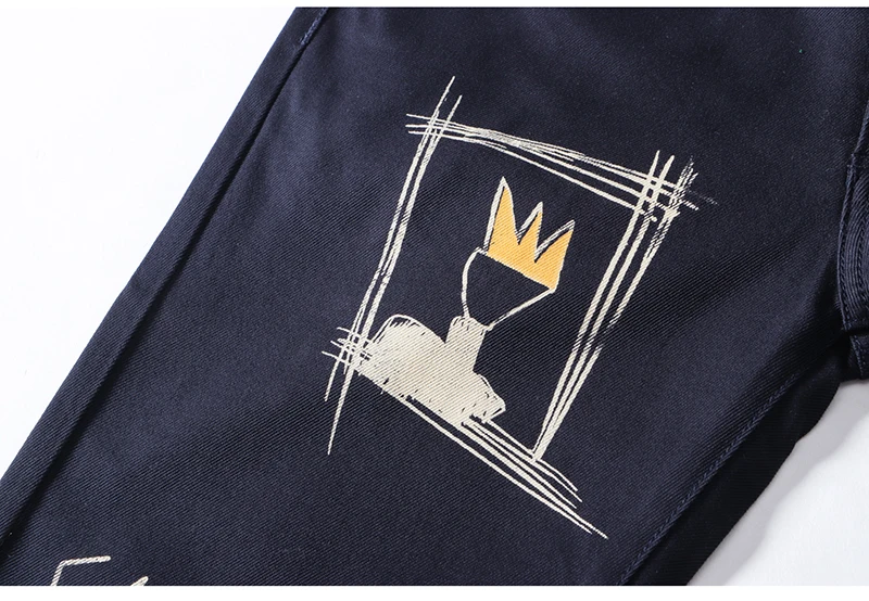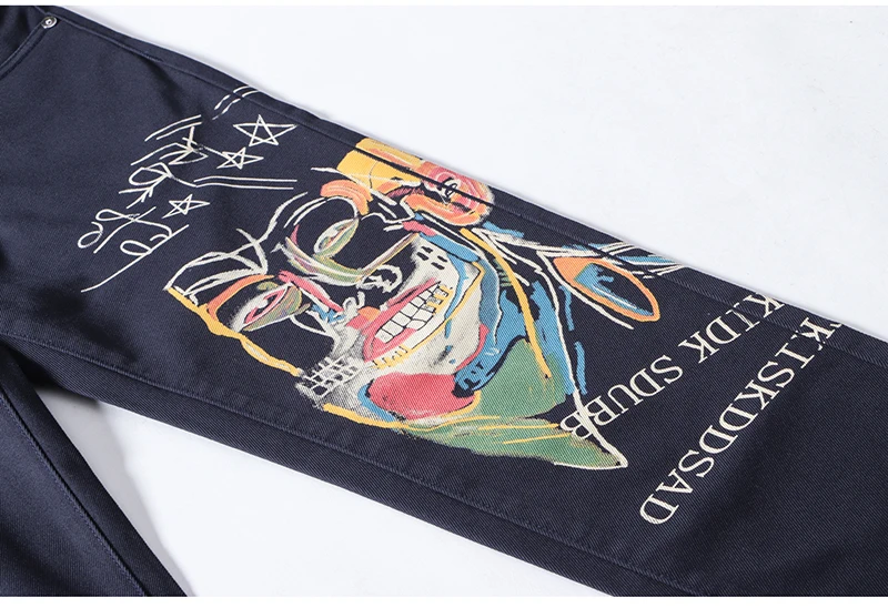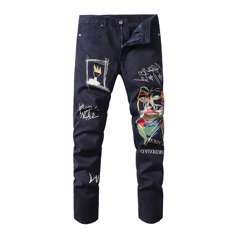 Sokotoo Men’s doodle printed jeans Slim fit straight colored drawing painted dark navy blue pants