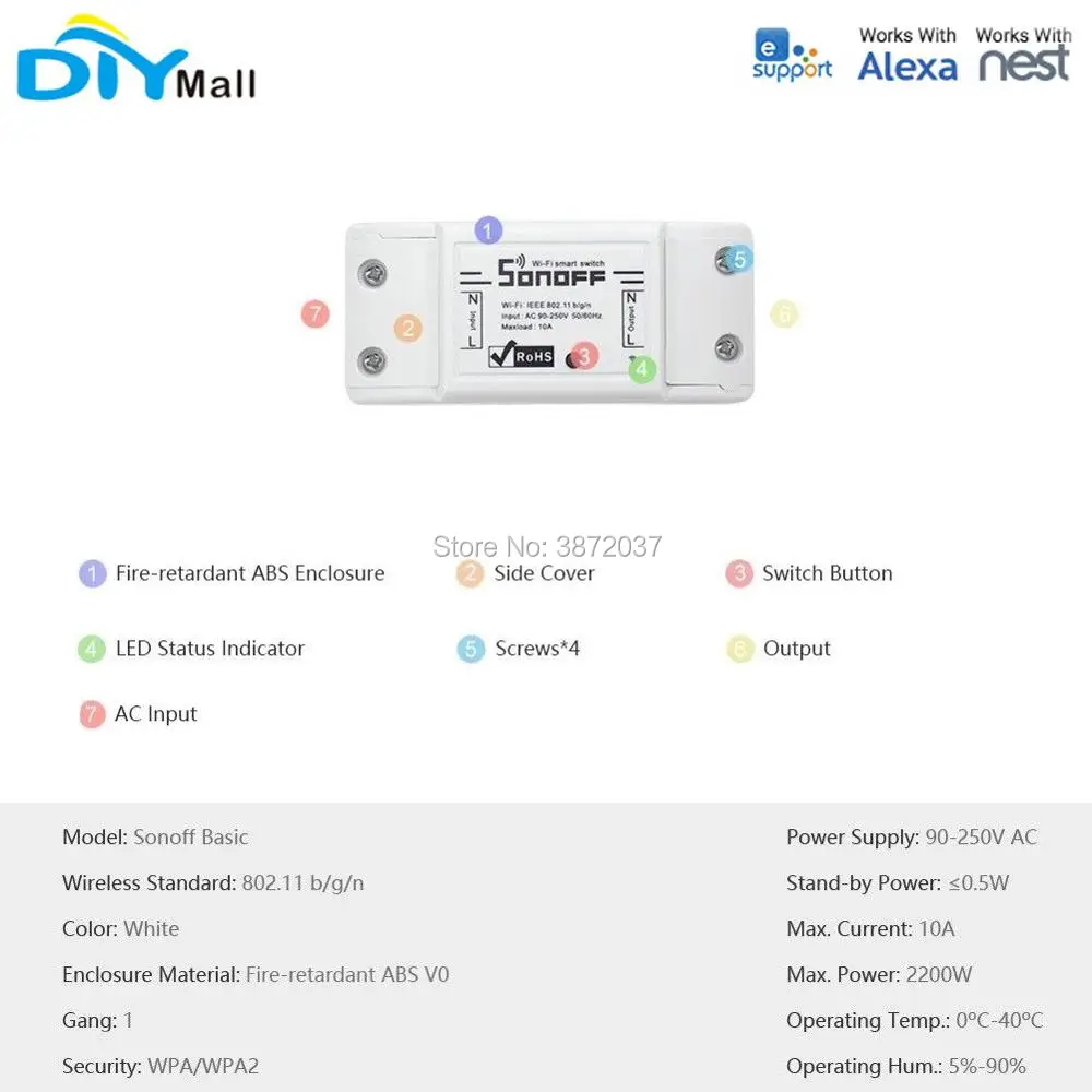Sonoff Basic Wifi Wireless Switch Smart Home Automation for Android IOS Phone APP Support Amazon Alexa Google Nest