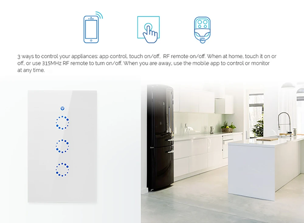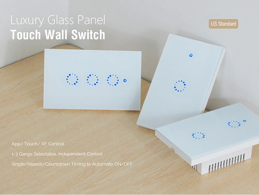 The Sonoff T1 US Smart Wall Touch Switch series are 1-3 gang US/AU standard WiFi RF remote control luxury smart light switch.