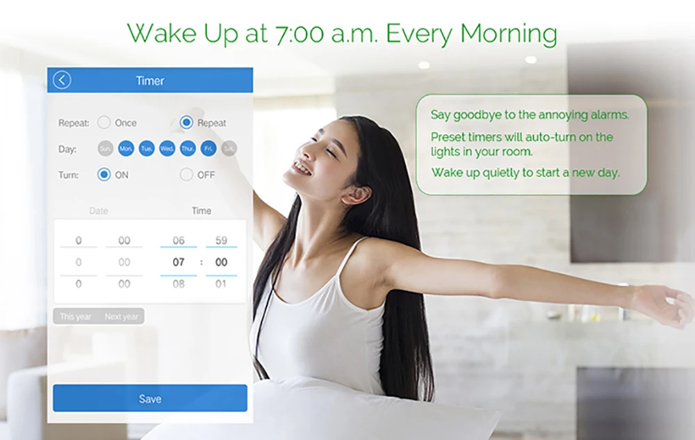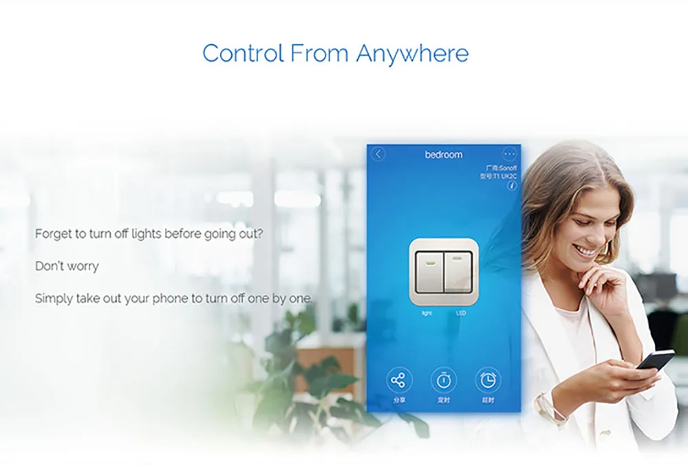 With the App eWeLink, you can create scheduled/countdown timers to auto-turn on/off devices at the specified time.