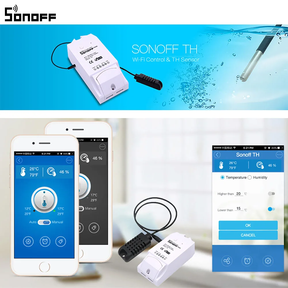 | Sonoff TH10 | Monitor and Set Temperature & Humidity | 90~250V AC | 10A | 2200W(10A) | 2.4Ghz | Click |