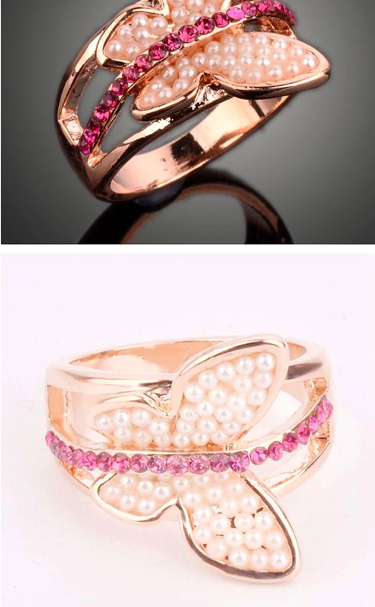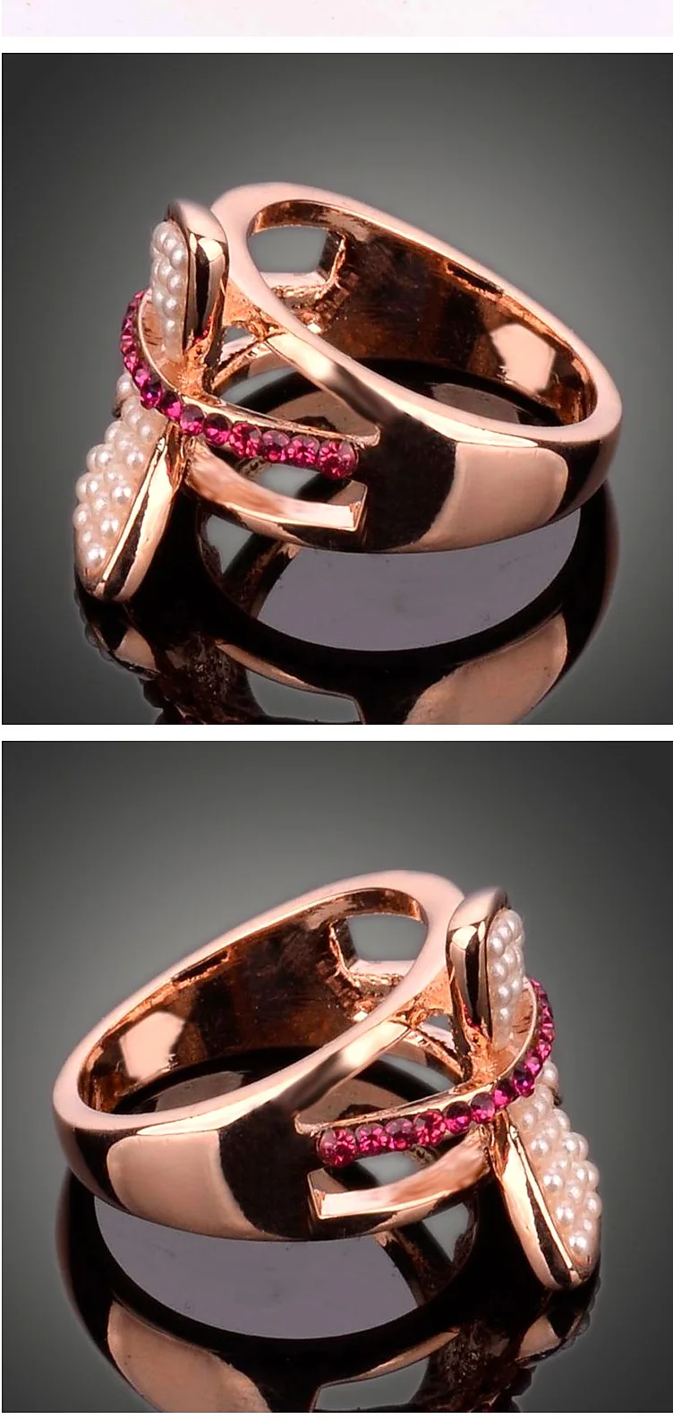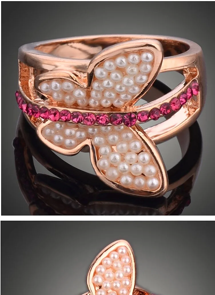 Sparkling Crstal Simulated pearl Butterfly Rings For Women Wedding Engagement Band Ring Gold Color Jewelry