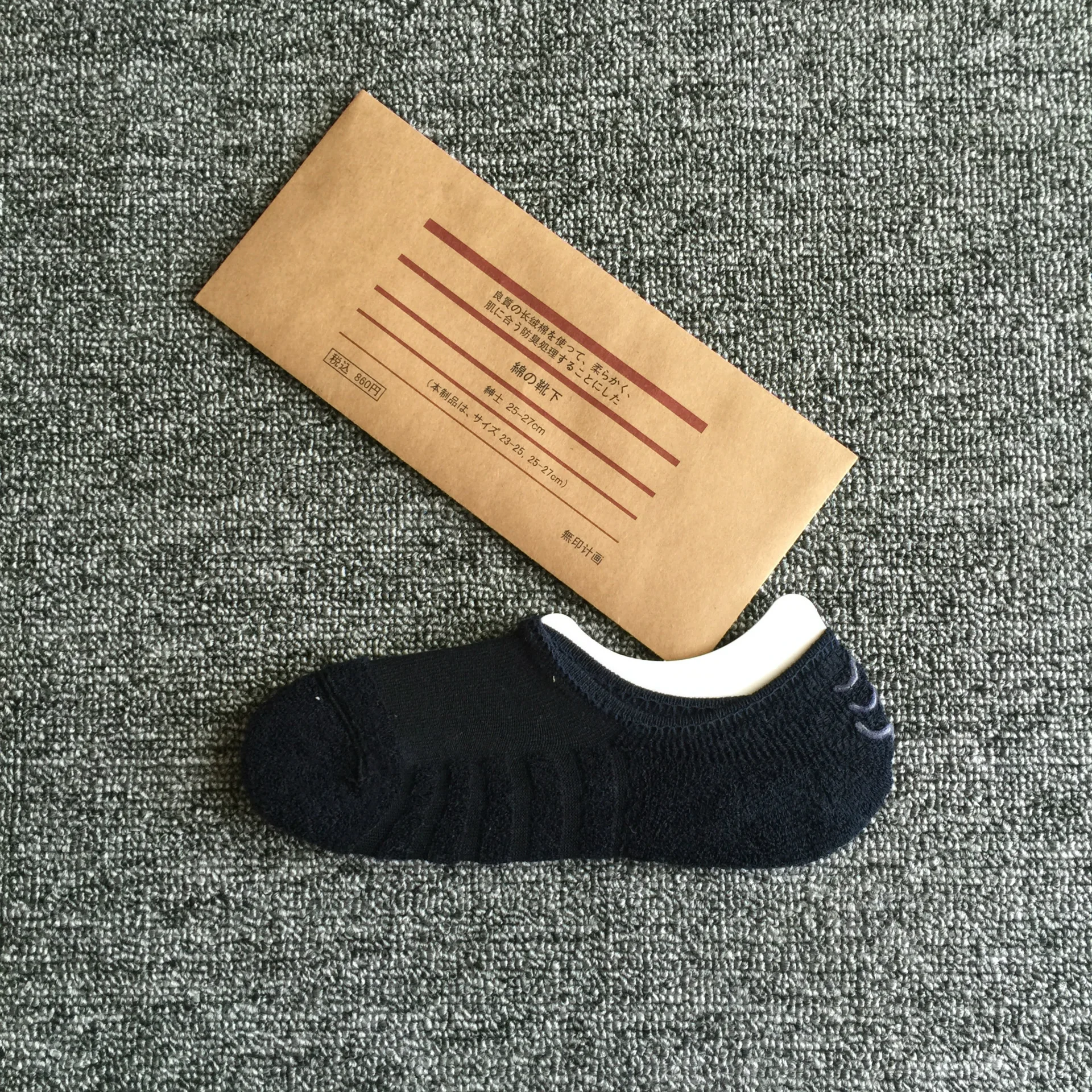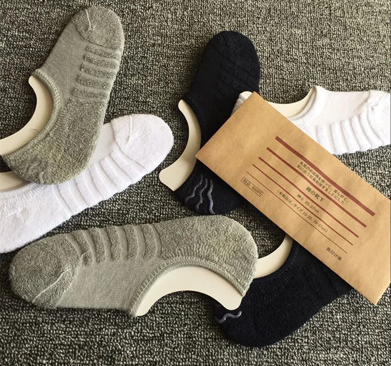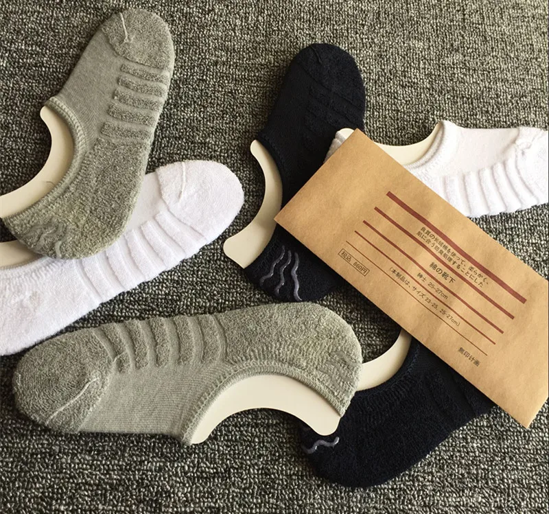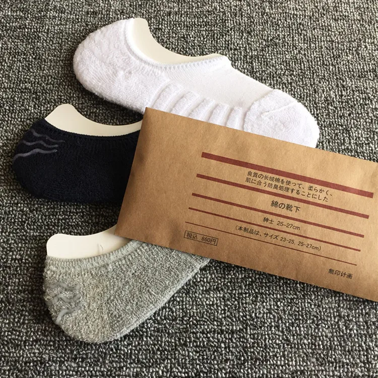 The new packaging has no printed plans for men’s spring and summer invisible socks, thicker terry bottom short boat socks.