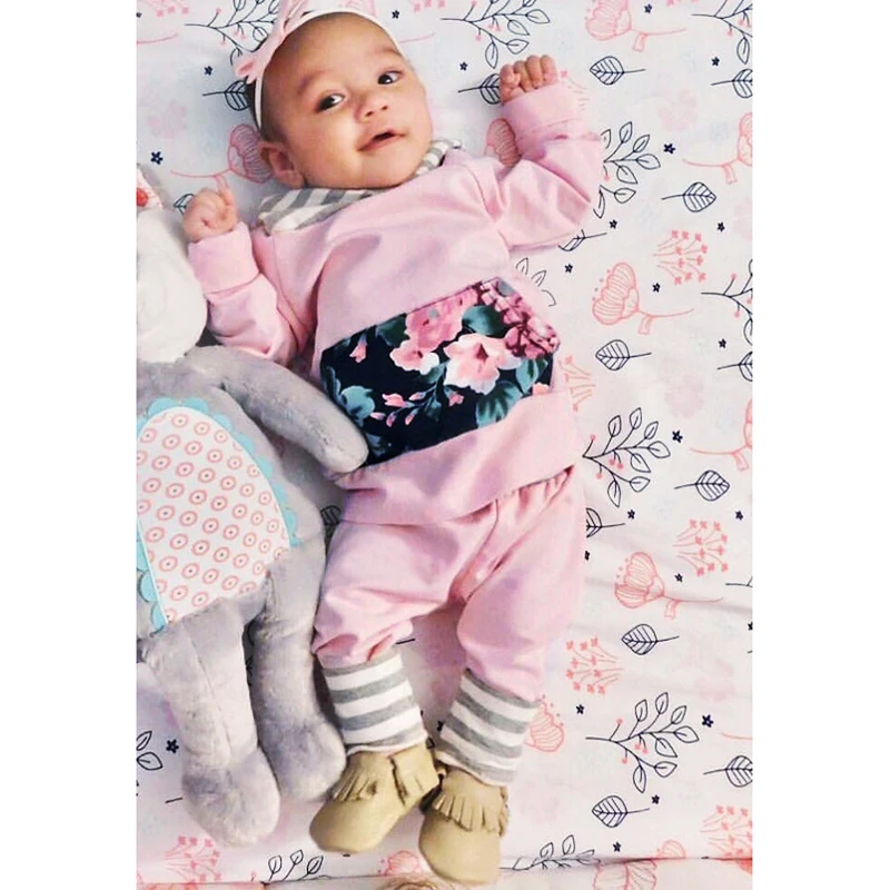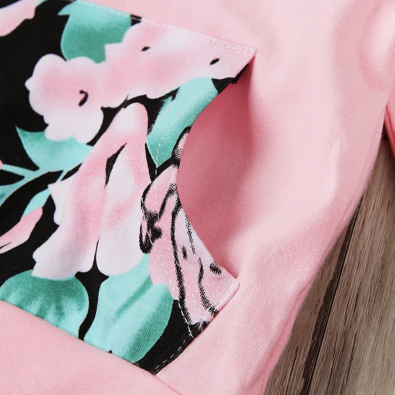 Spring Autumn Children’s Clothing Set Baby Girls Pink Sweater Hoodie Roses Pocket Cotton Striped Hat Overalls For Newborn Grils