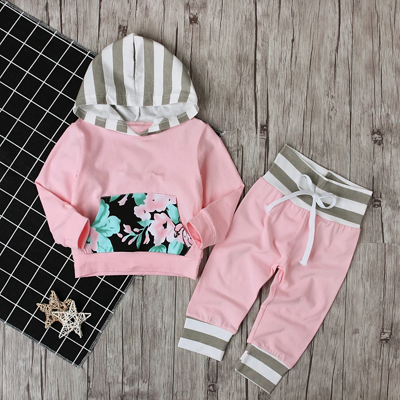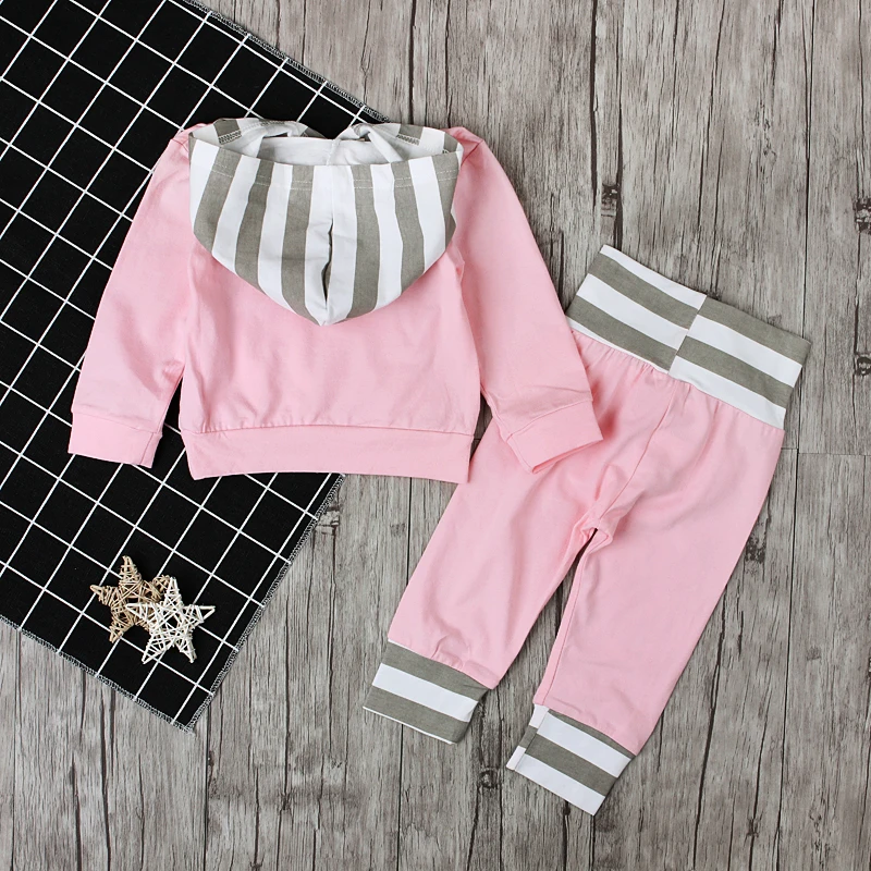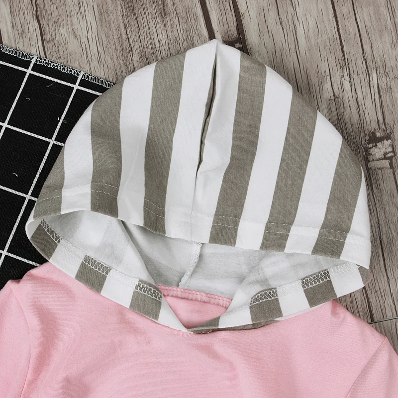 Spring Autumn Children’s Clothing Set Baby Girls Pink Sweater Hoodie Roses Pocket Cotton Striped Hat Overalls For Newborn Grils