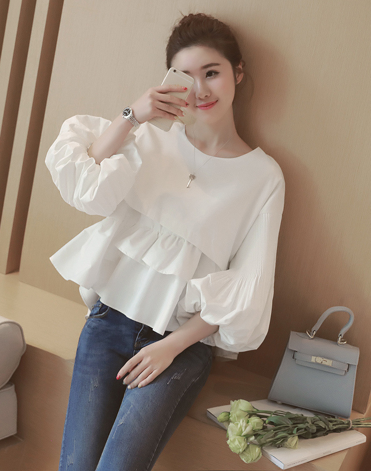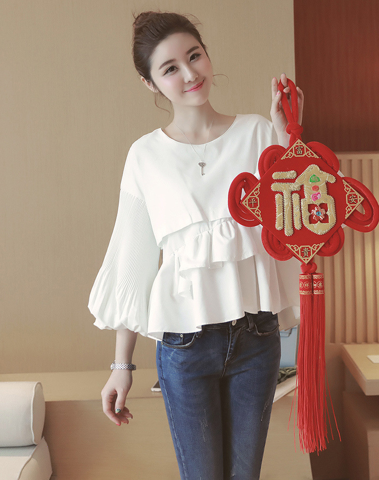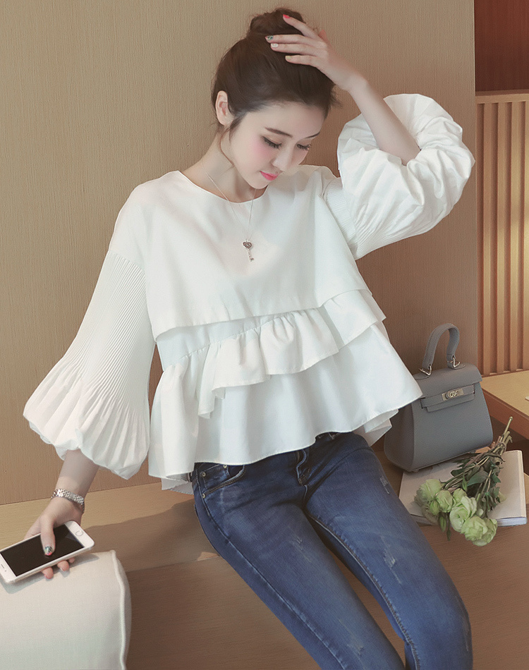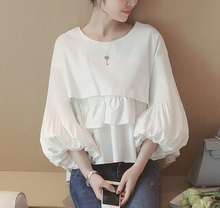 spring women white sweet 3/4 lantern sleeve ruffles splicing blouse o neck crop tops female casual cute folds shirt crop tops