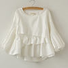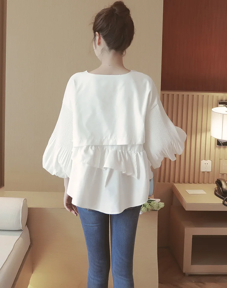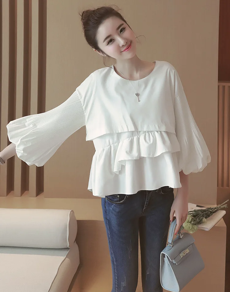 spring women white sweet 3/4 lantern sleeve ruffles splicing blouse o neck crop tops female casual cute folds shirt crop tops