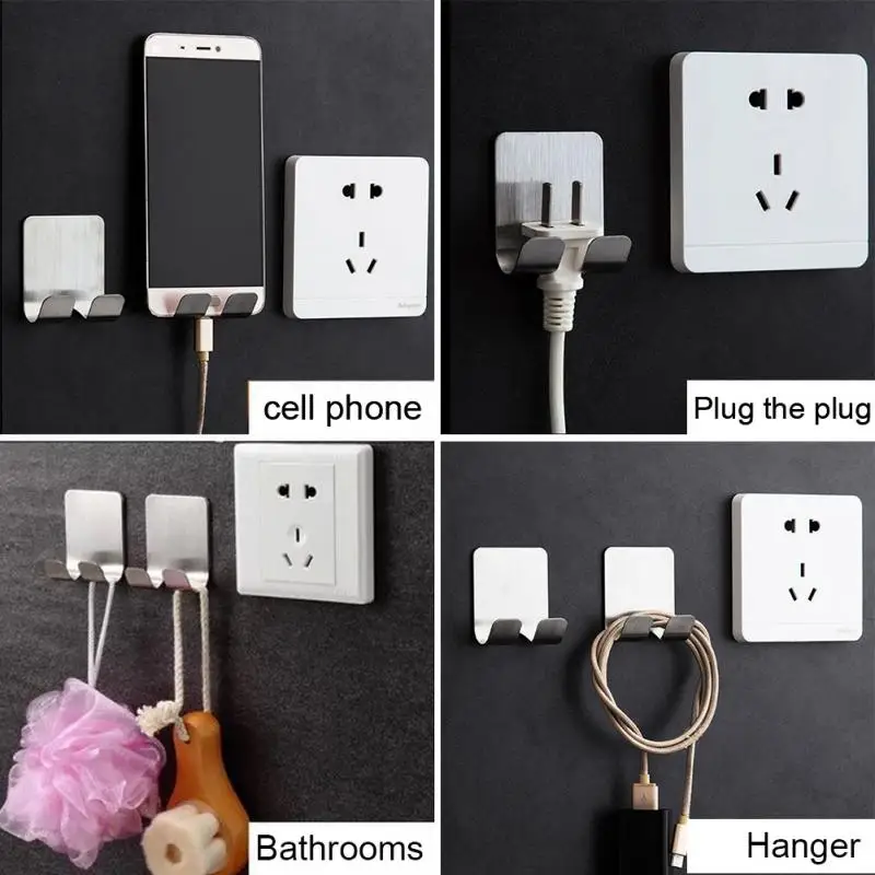 Stainless Steel Double Socket Rack Wall Organizer Practical Self Adhesive Professional Plug Hook