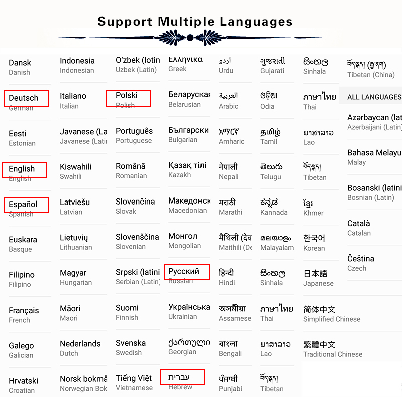 10.Multiple Languages——— YES (Russian,Spanish,English,Hebrew,Arabic,French,etc)
