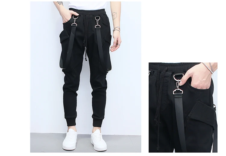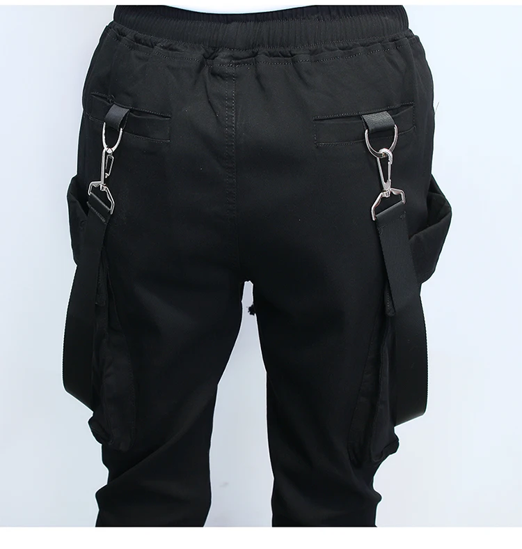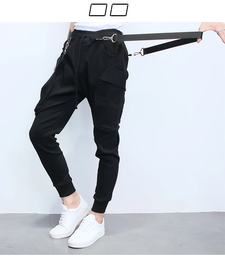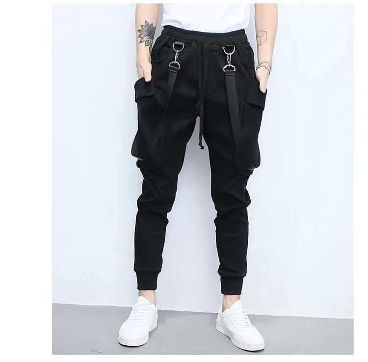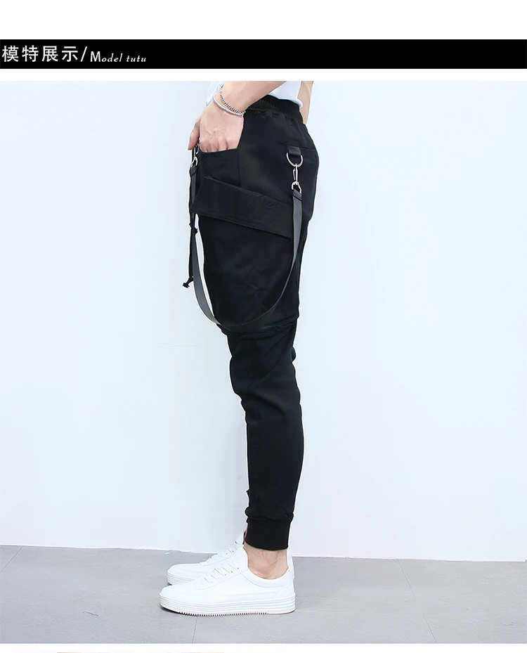 Street Punk hip-hop strap Harem pants Male Korean hair stylist jumpsuits Men Multi-pocket Elastic Waist Dancing Joggers A70301