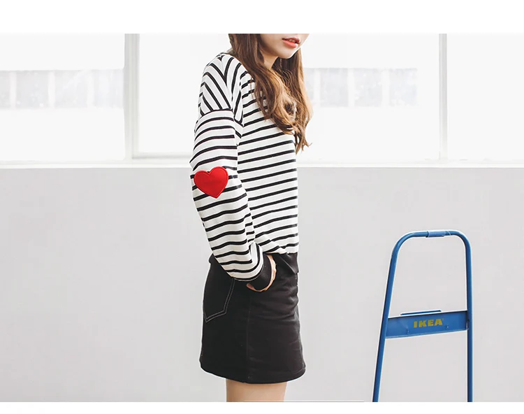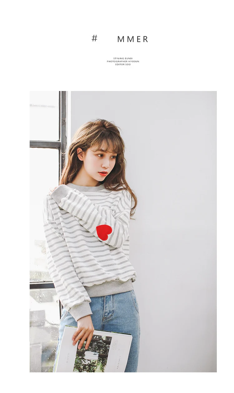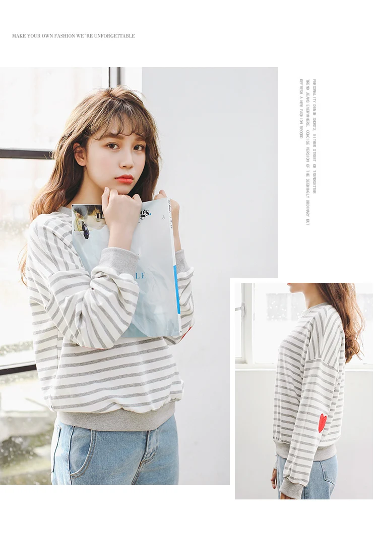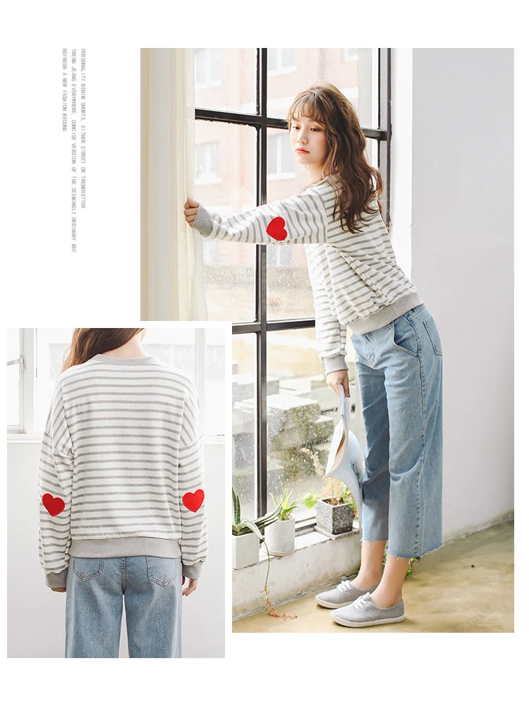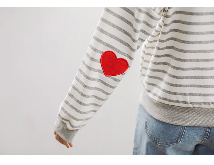 Striped College Wind Heart Embroidered Loose Causal Basic Female Thin Sweatshirt