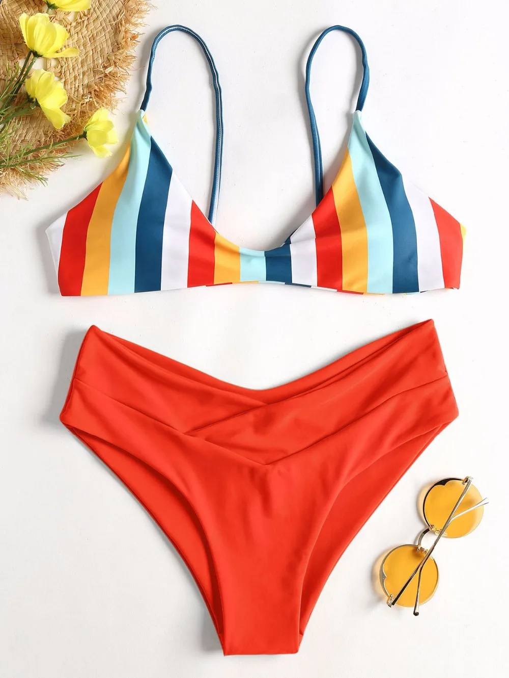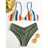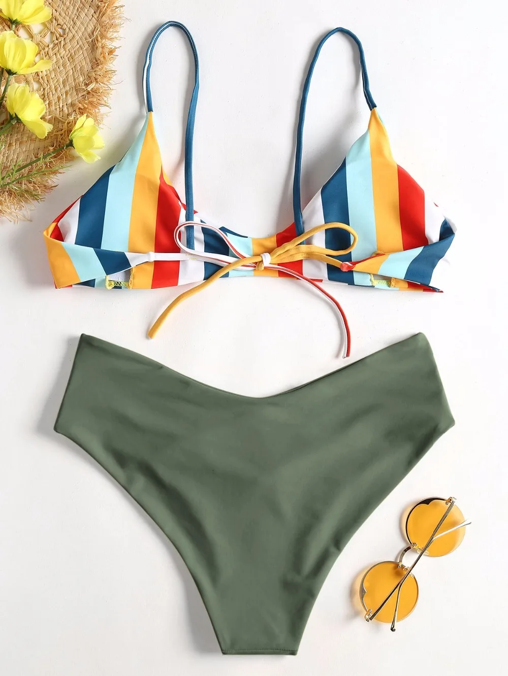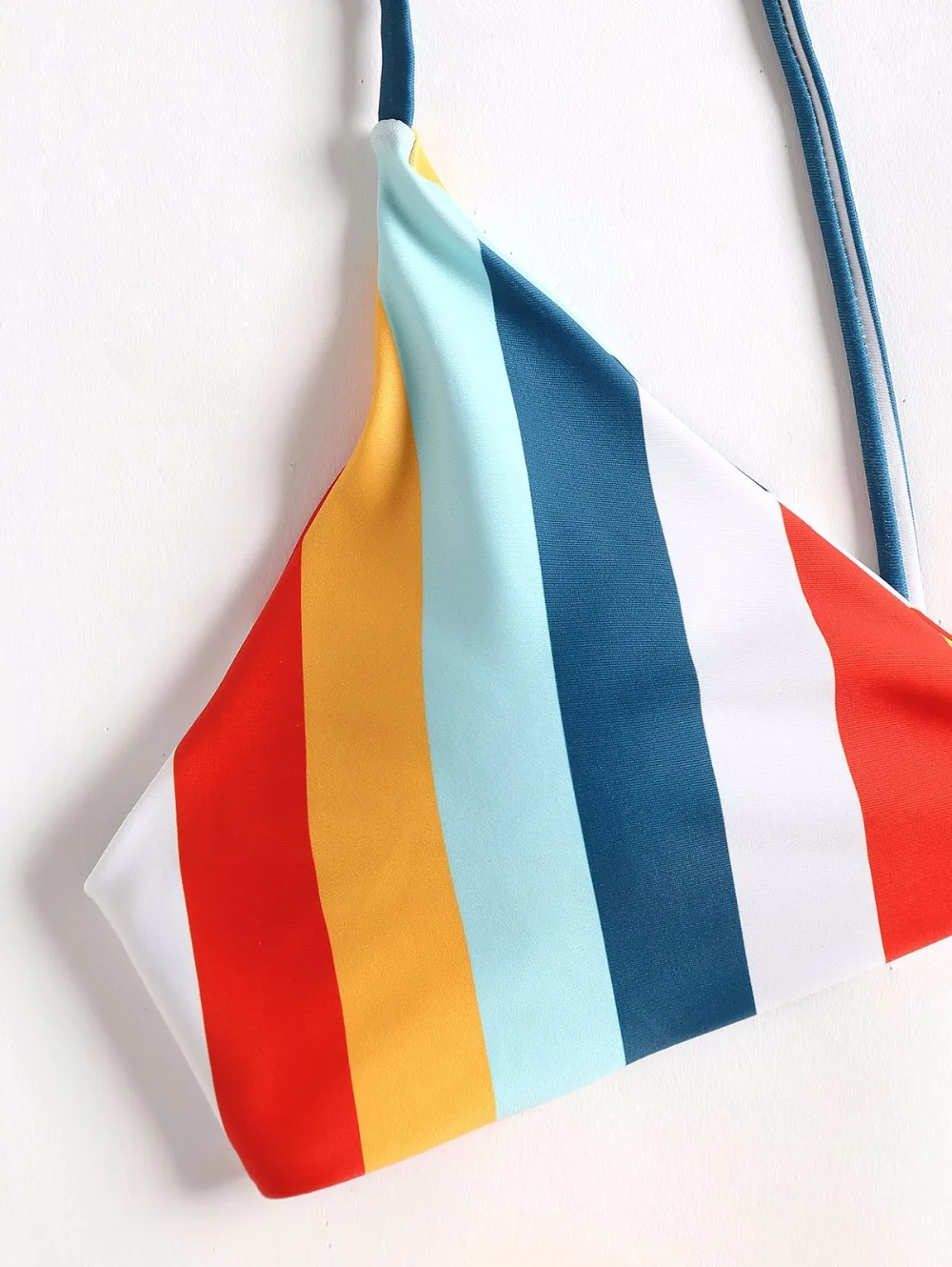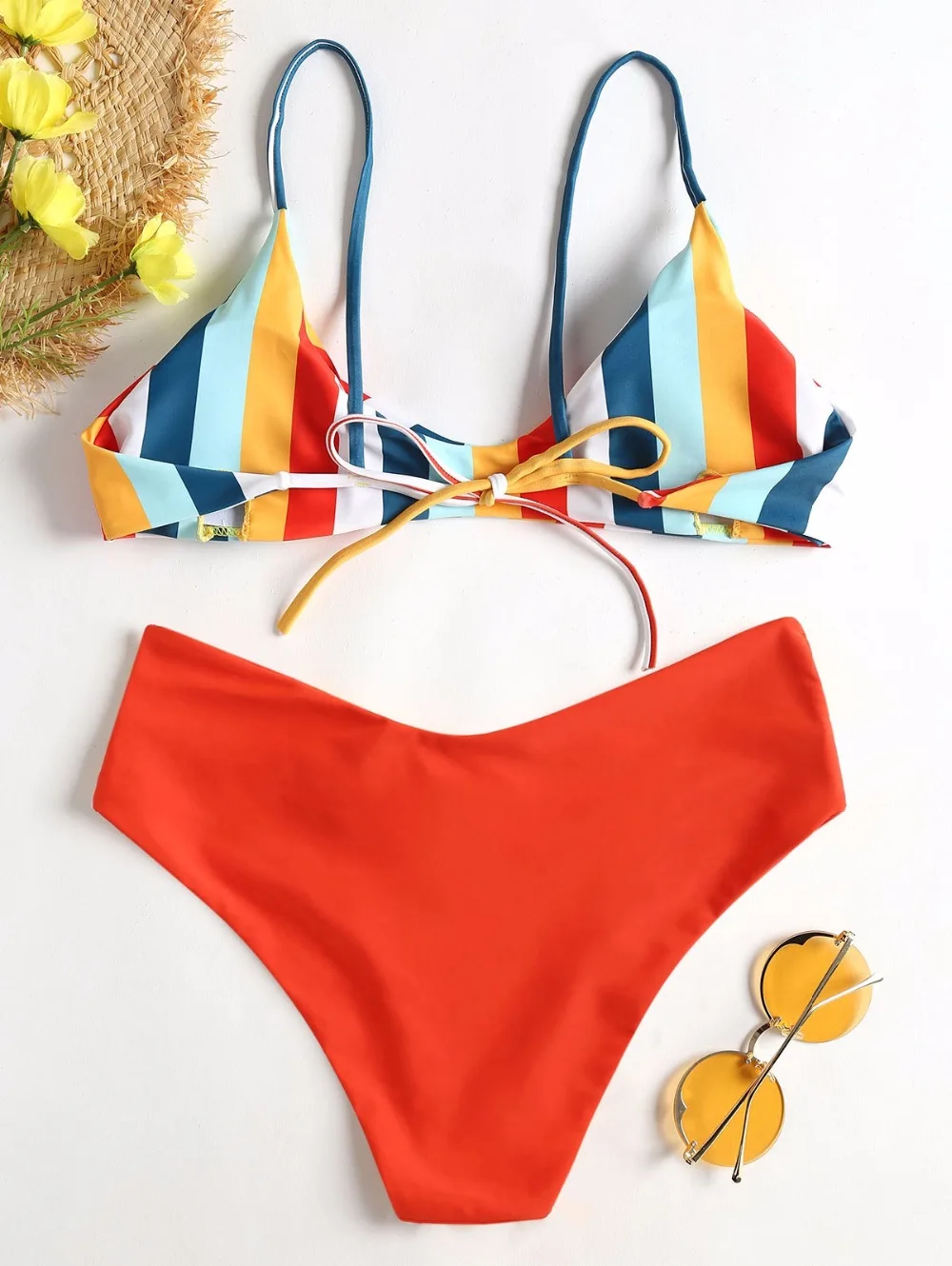 Colorful stripes brighten this bikini top featuring slender shoulder straps and self tie closure at back. The sponge pads in the bra are removable that you can remove them to wear as an effortless bralette top. A pair of solid high cut briefs is included to complete the look. Just take it for your vacation season, you won’t regret getting it.