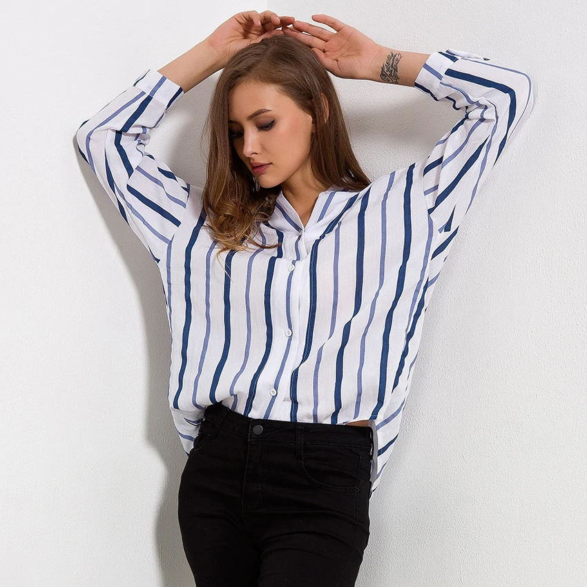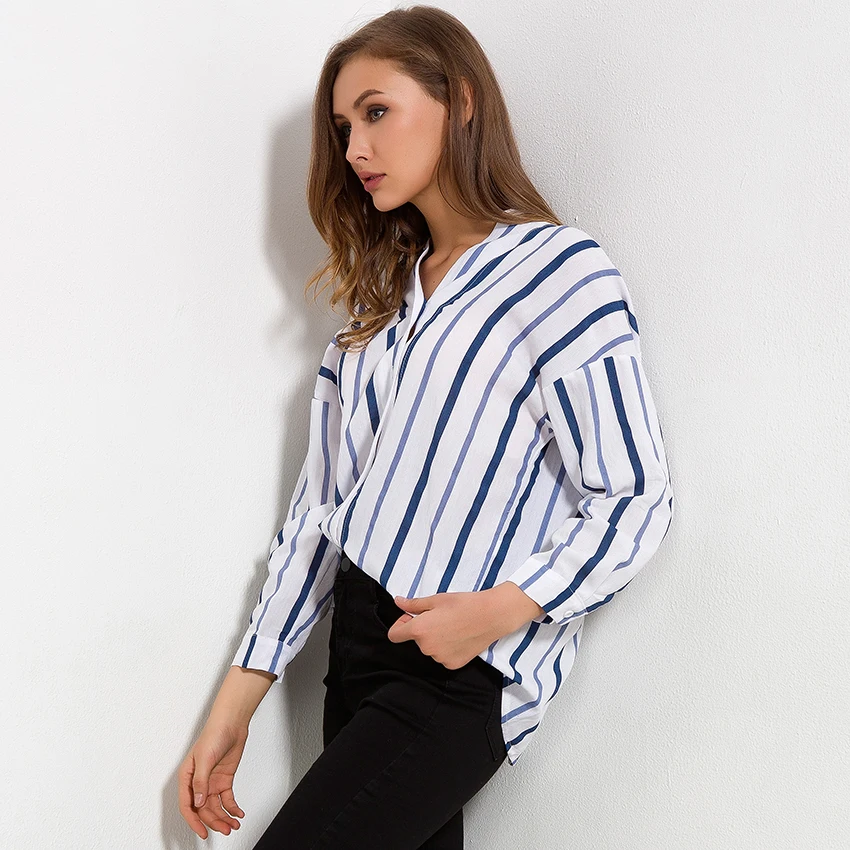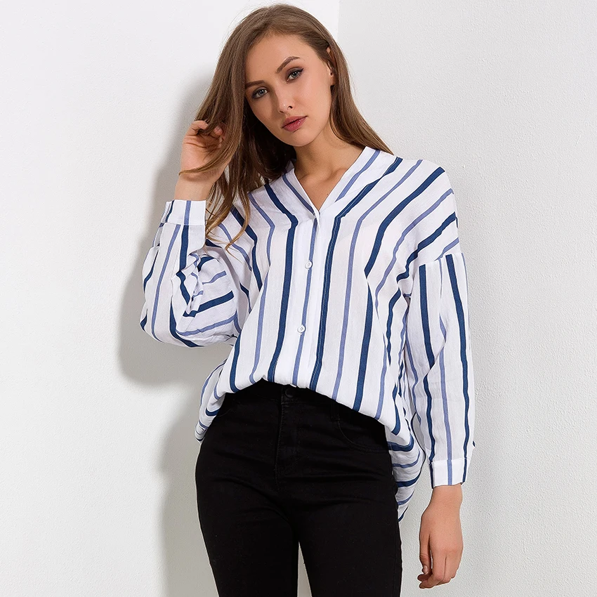 Striped Shirt Women 2018 Autumn New Arrival V-Neck Cotton Casual Blouses Ladies Loose Long Sleeve Shirts Womens Tops and Blouses