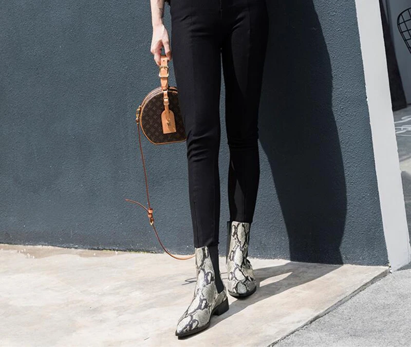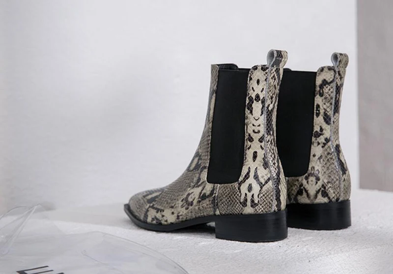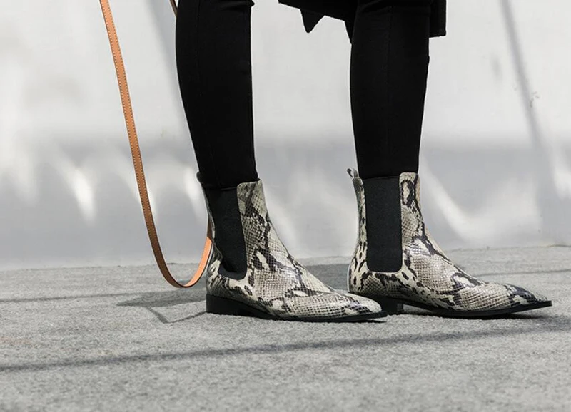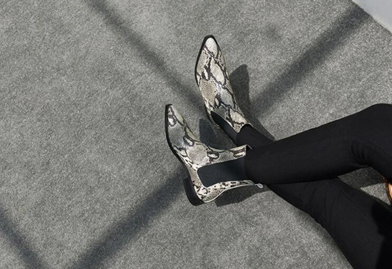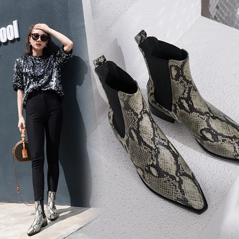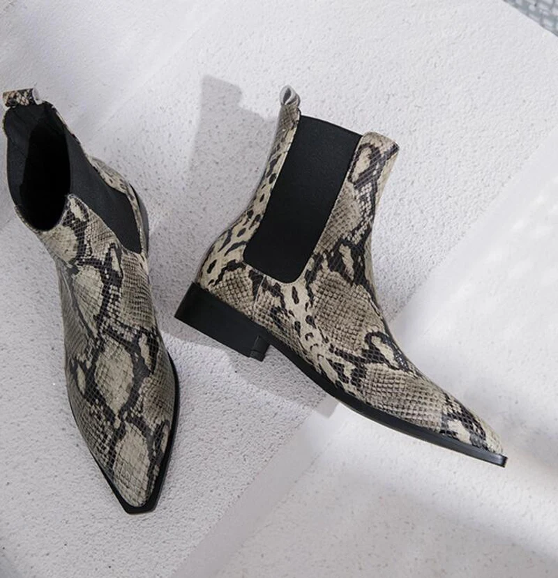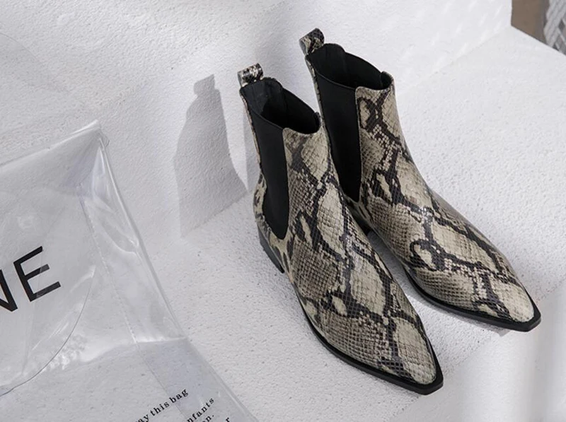Stylesowner 2018 Newest Snake skin cow leather Short Boots pointy toe runway style Ankle Boots for women low heel knight boot