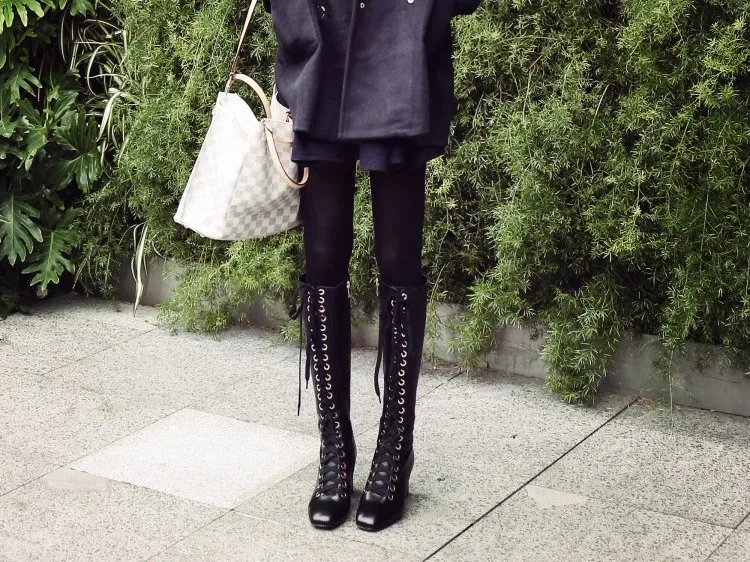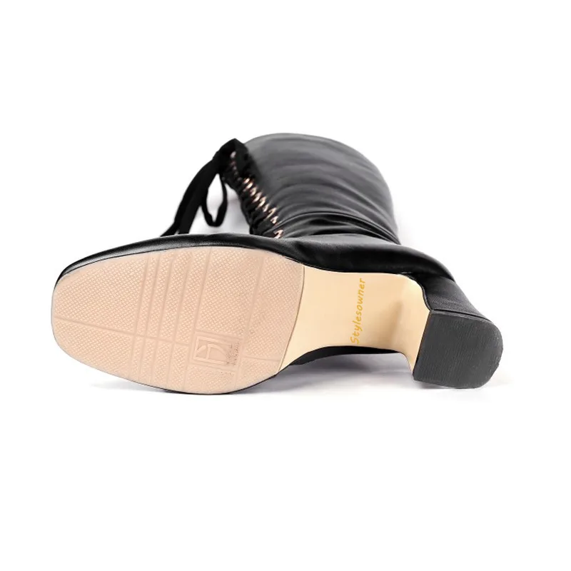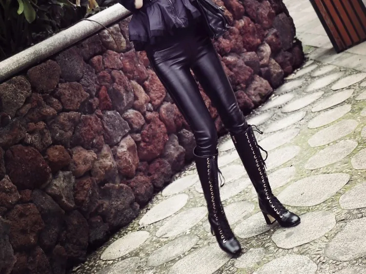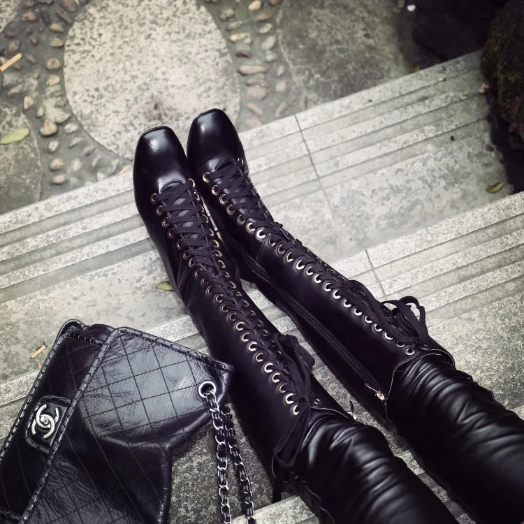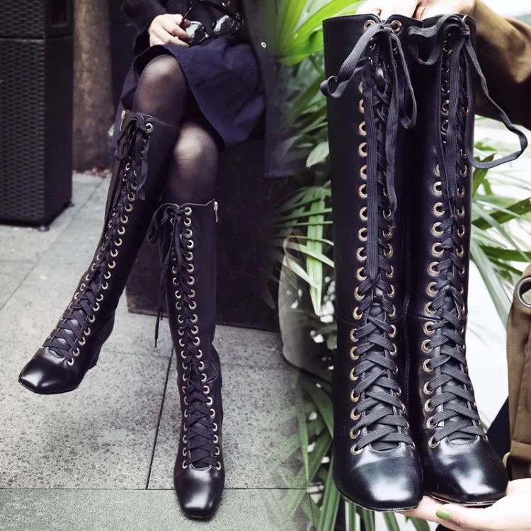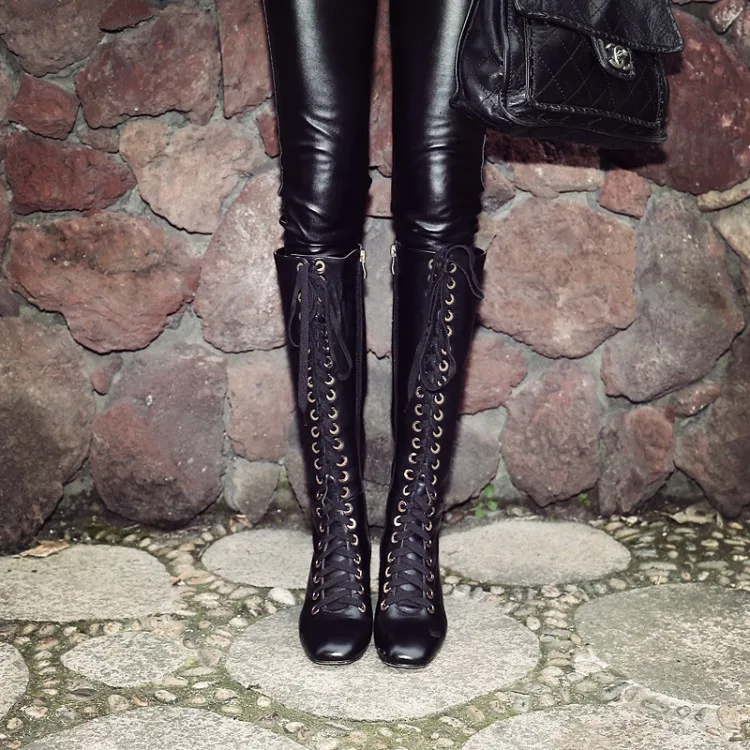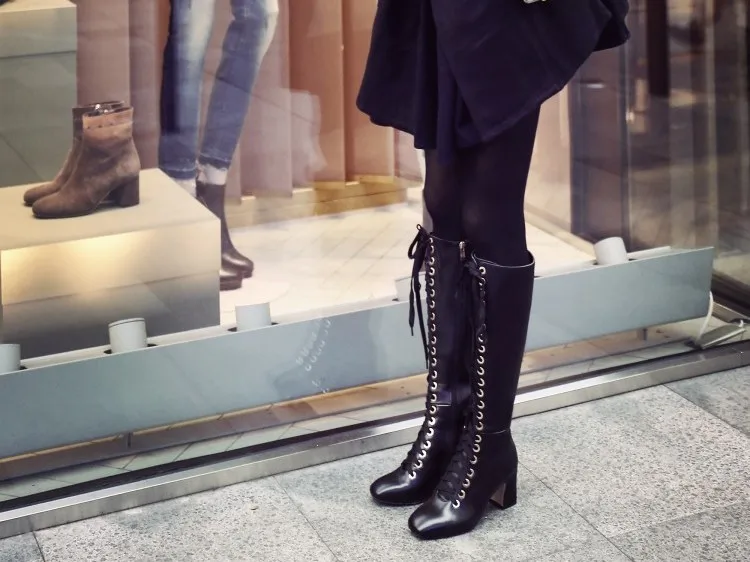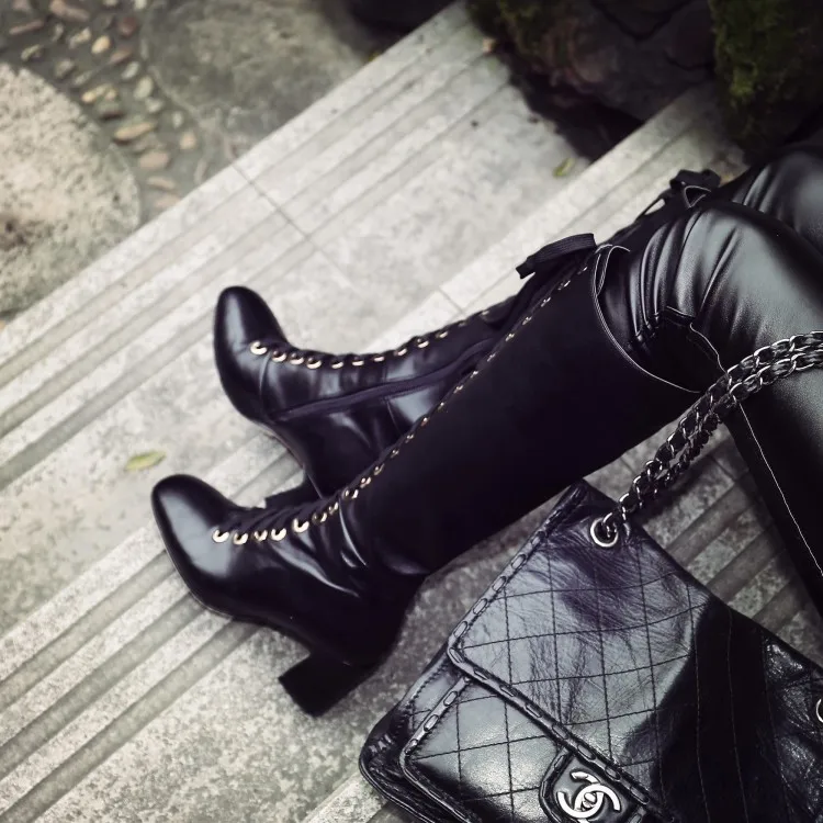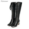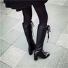 Stylesowner New Arrived Lace Up Long Boots Real Leather High Heels Knee High Winter Boots With Plush Inside Warm Cozy Boots