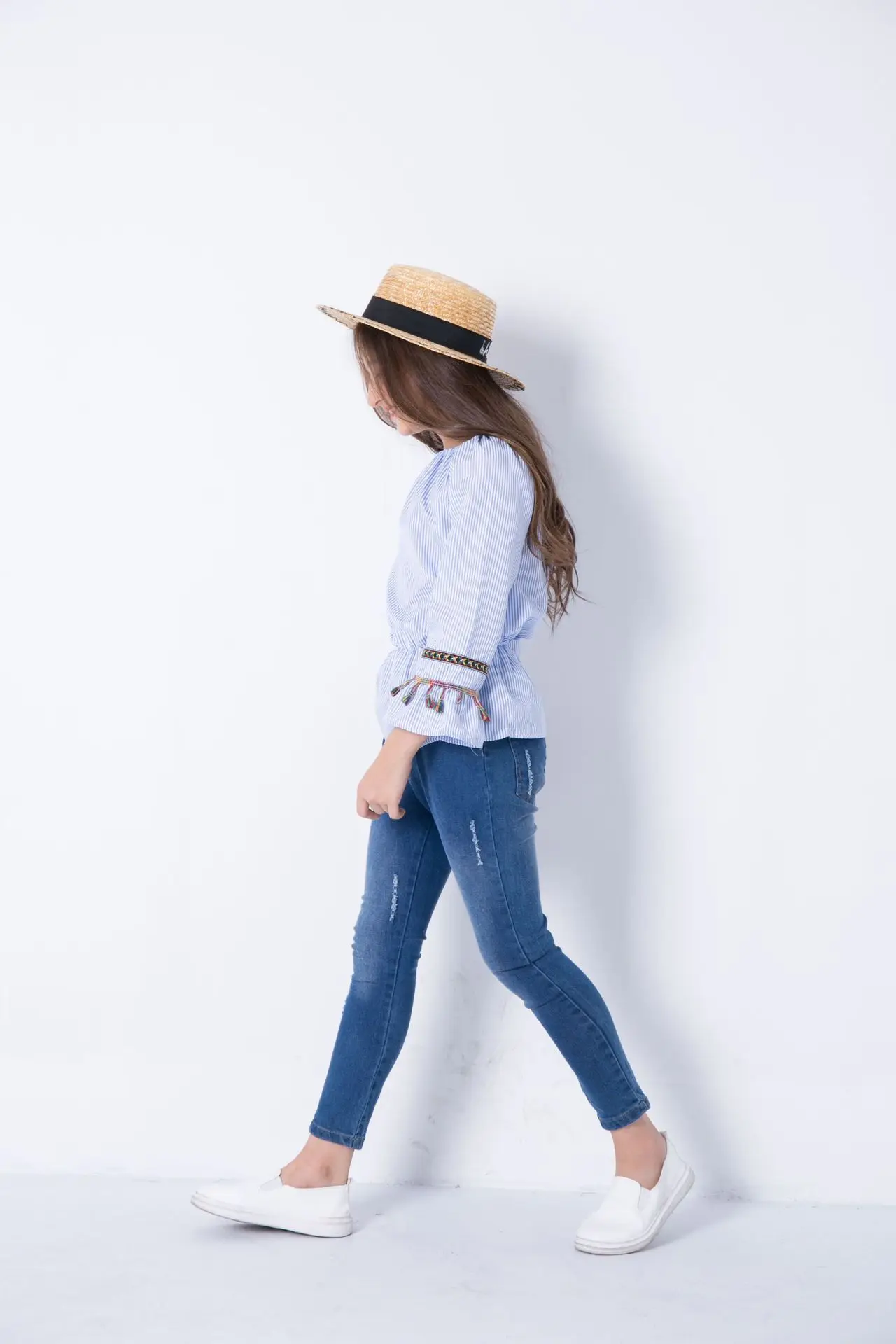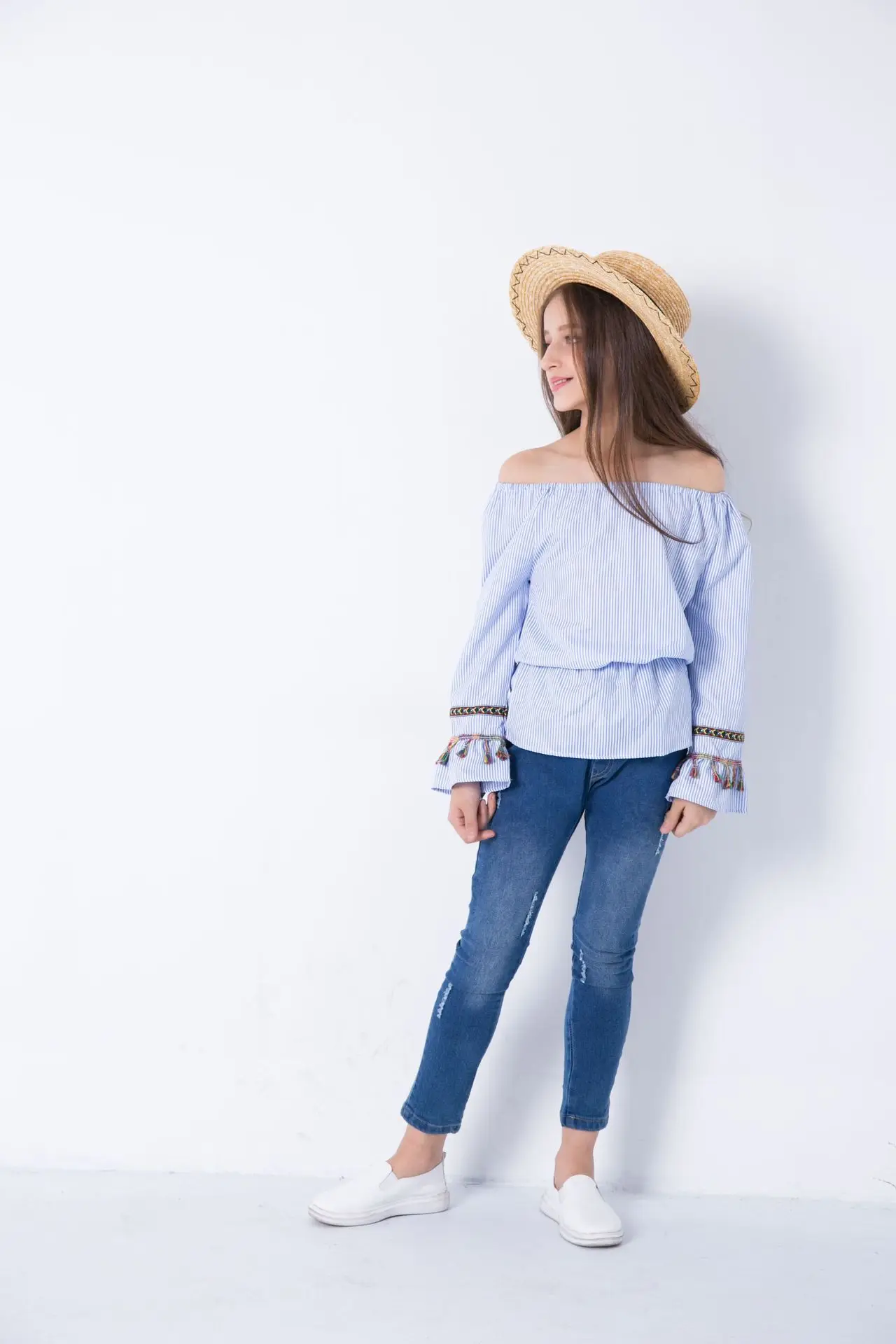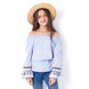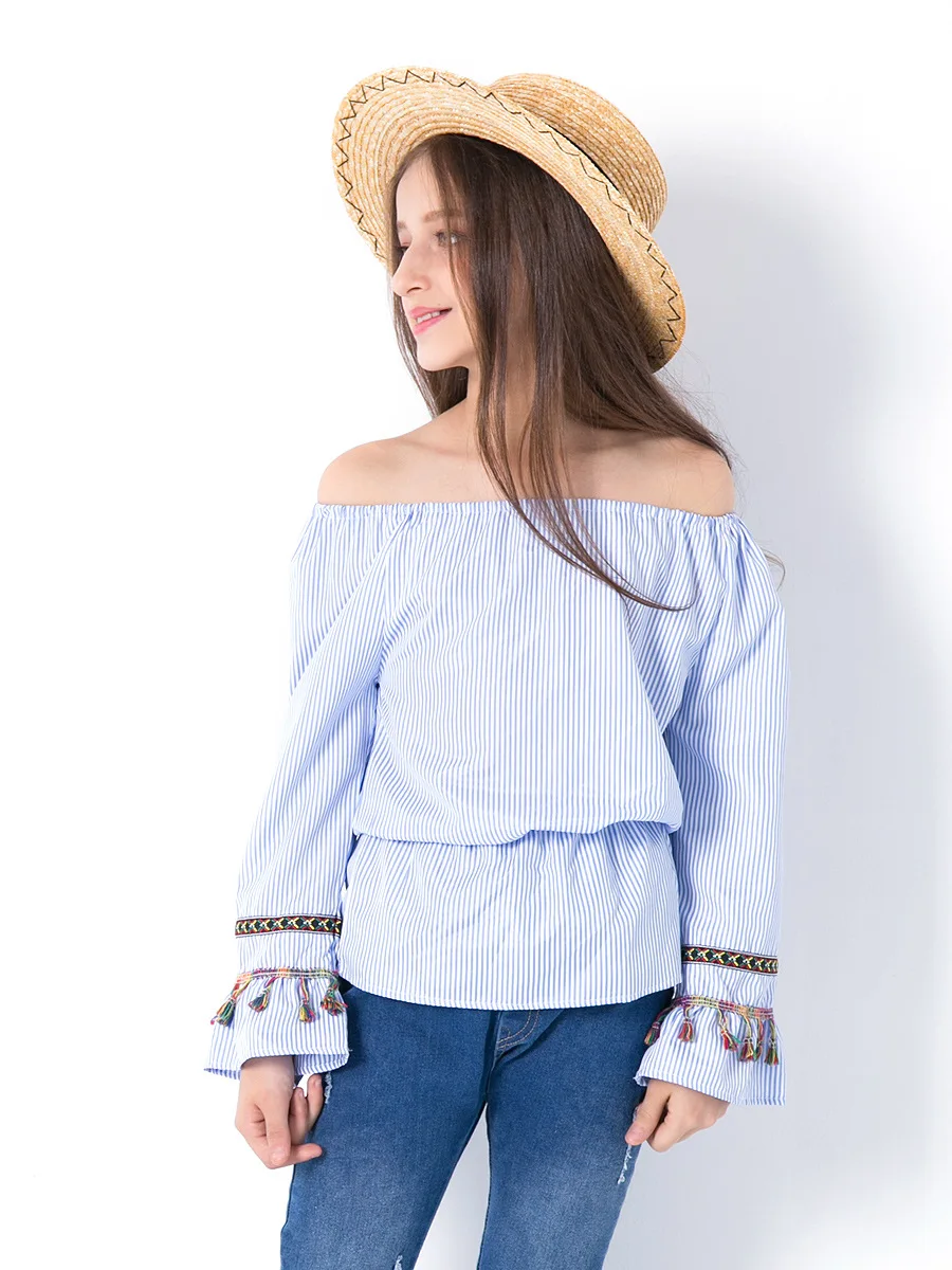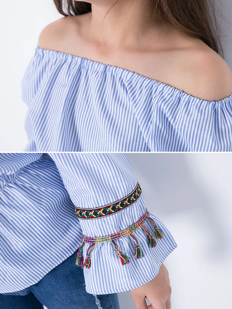 Summer Teenage Girls Clothing Vintage Tassel Blouse 2018 Girl Bare Shoulder Fashion Striped shirt Embroidery Blouse Kids Clothes