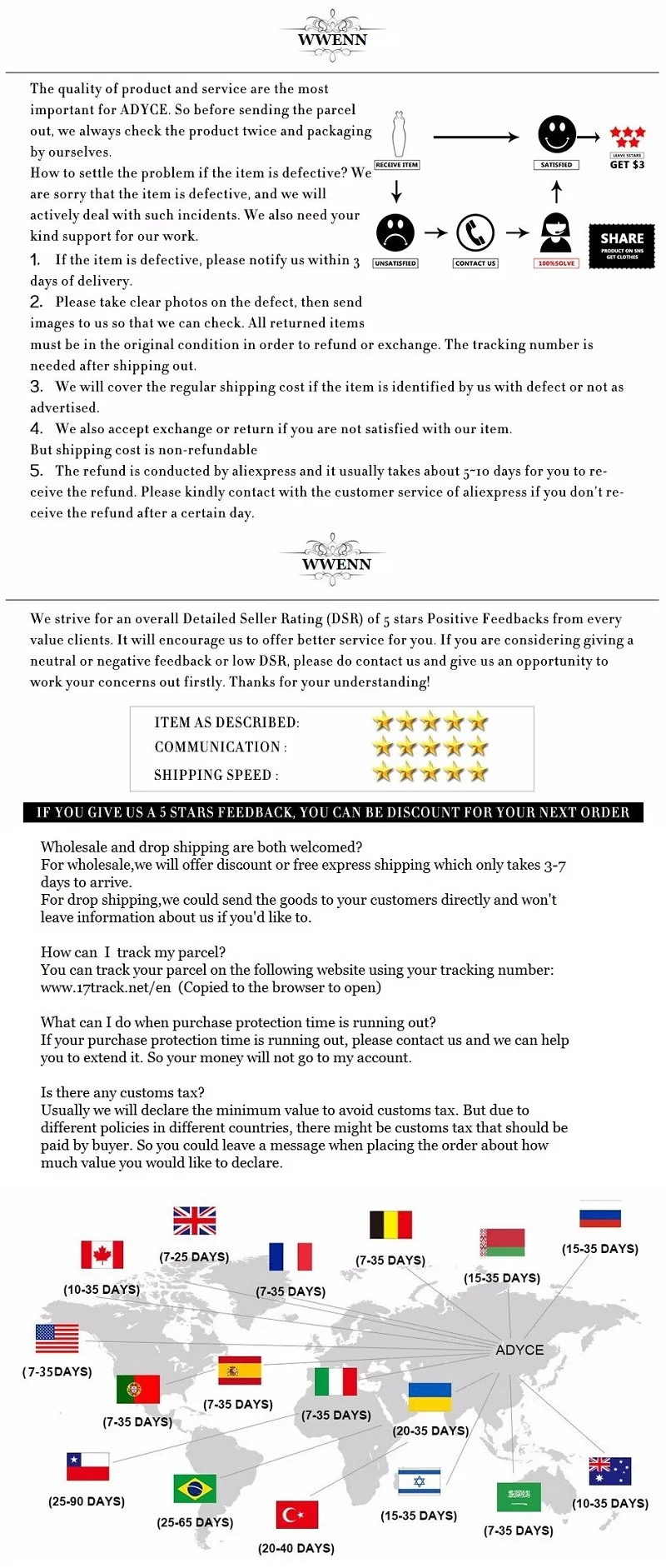 • If you did not receive the product within the guaranteed time( 45 days not including 2-5 day processing) you can request a refund or a reshipment.