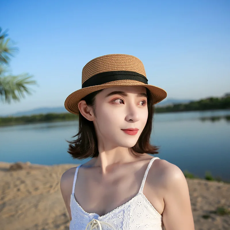 Summer Women Boater Beach Hat Female Casual Panama Hat Lady Brand Classic Ribbon Bowknot Straw Flat Sun Hats Women Fedora