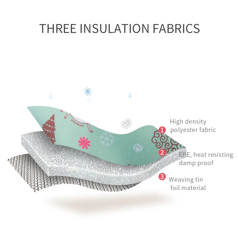 Made of polyester,built-in foil insulation, keeping warm or cold, waterproof, keeping fresh, convenient to open, portable handle, wear-resistant.