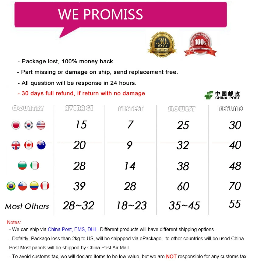• If you did not receive the product within the guaranteed time( 45 days not including 2-5 day processing) you can request a refund or a reshipment.