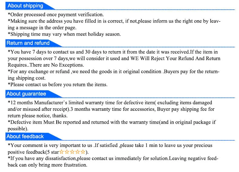 • If you did not receive the product within the guaranteed time( 45 days not including 2-5 day processing) you can request a refund or a reshipment.