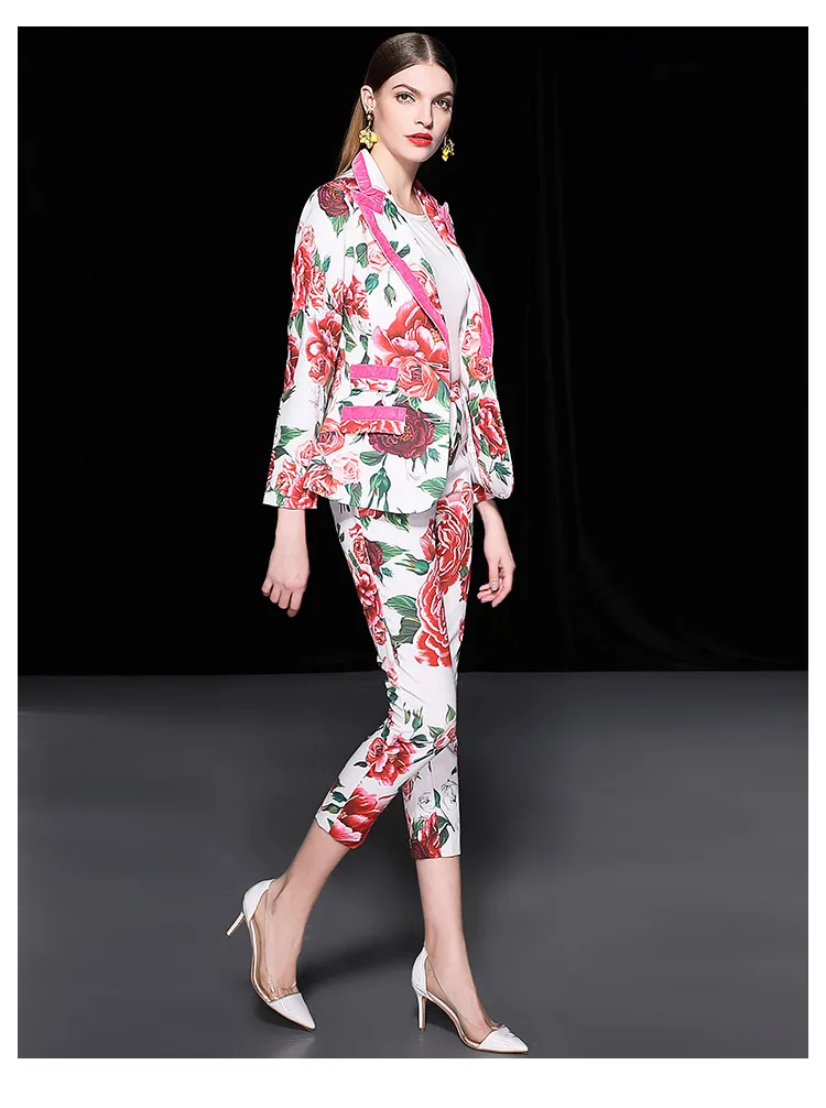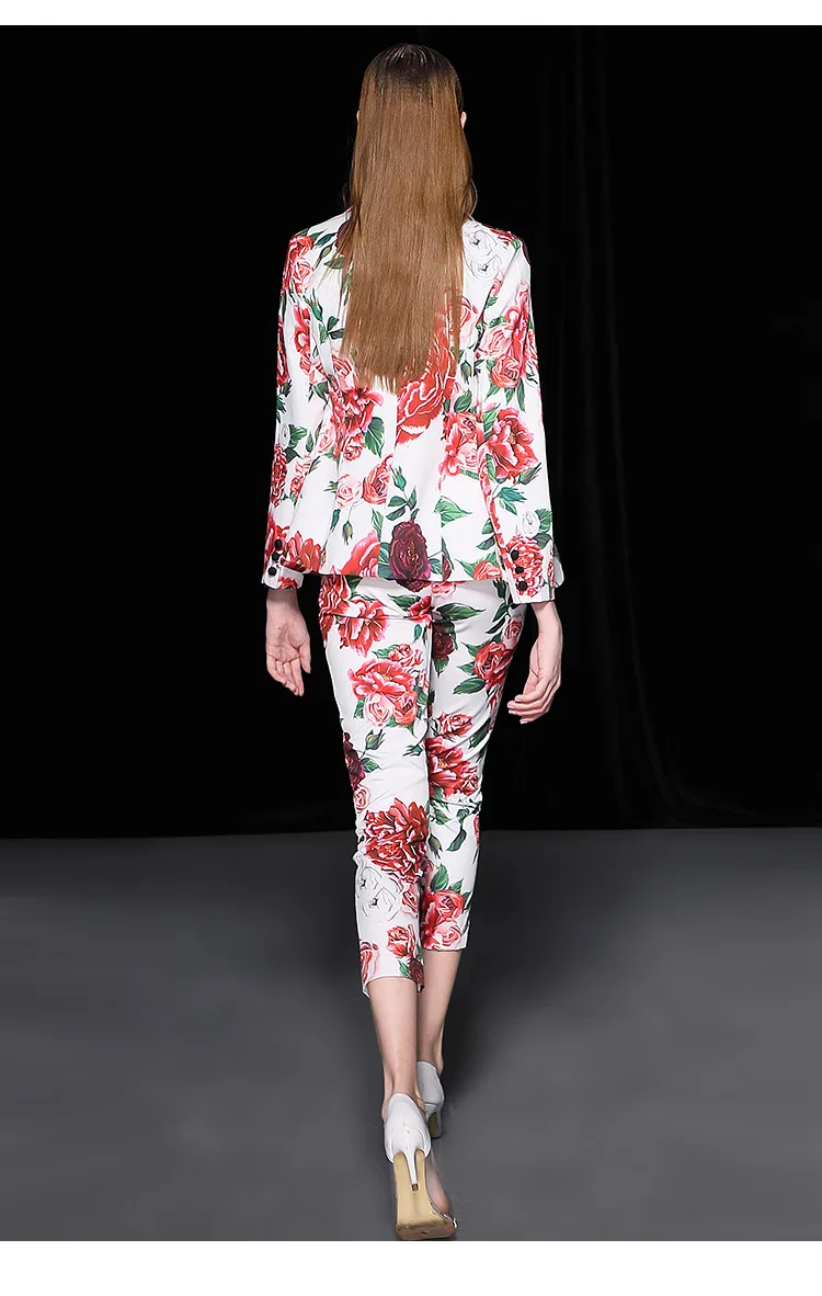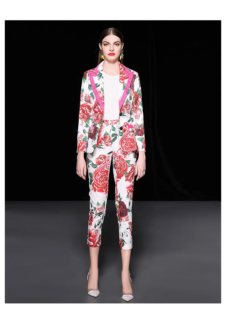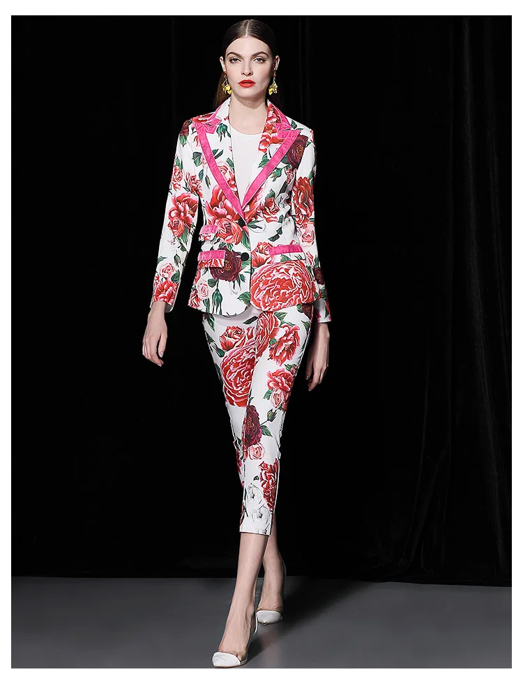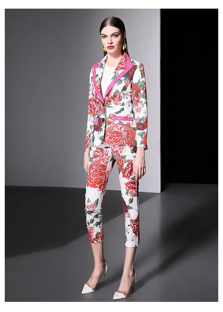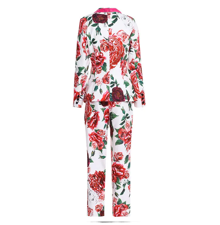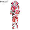 Svoryxiu 2018 Autumn Winter Runway Two Piece Set Women’s High Quality Peony Flower Printed Elegant Slim Blazers Pants Set