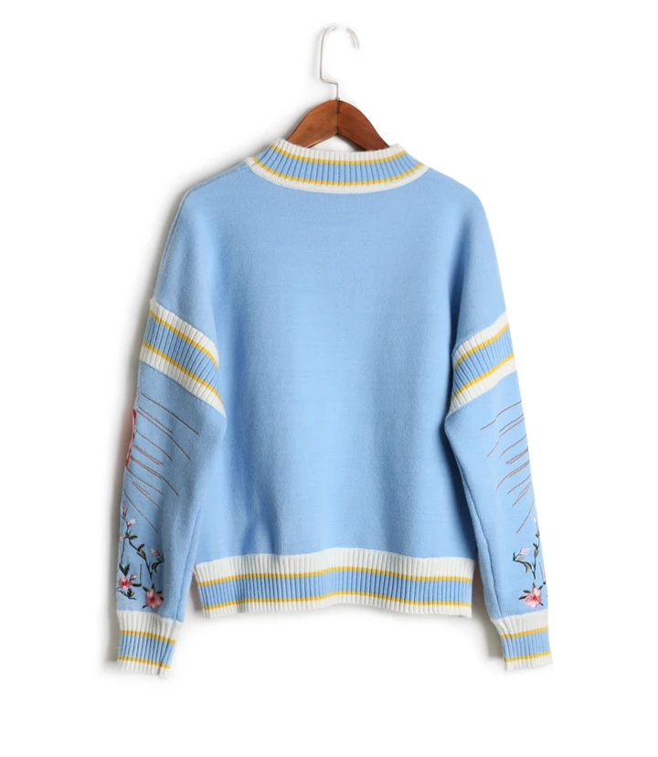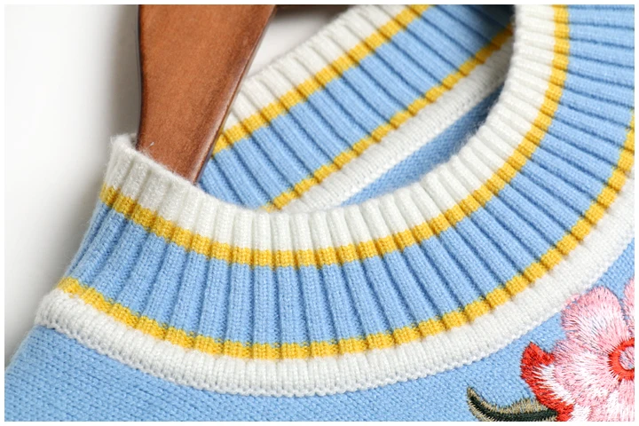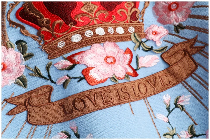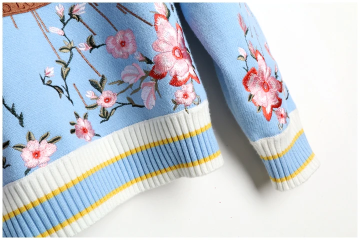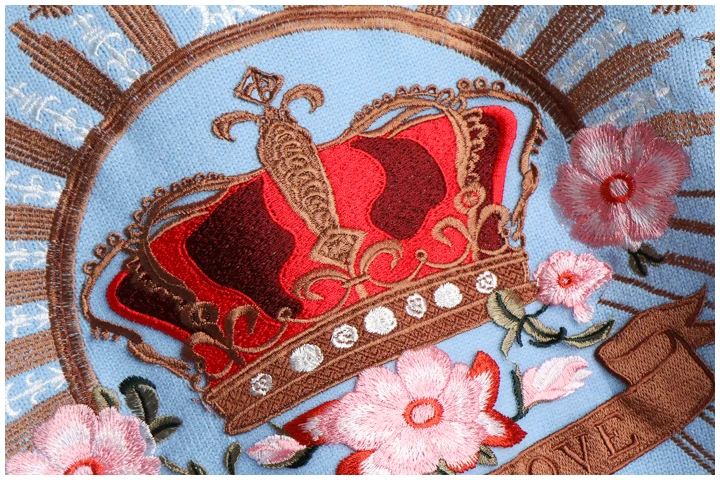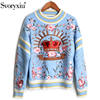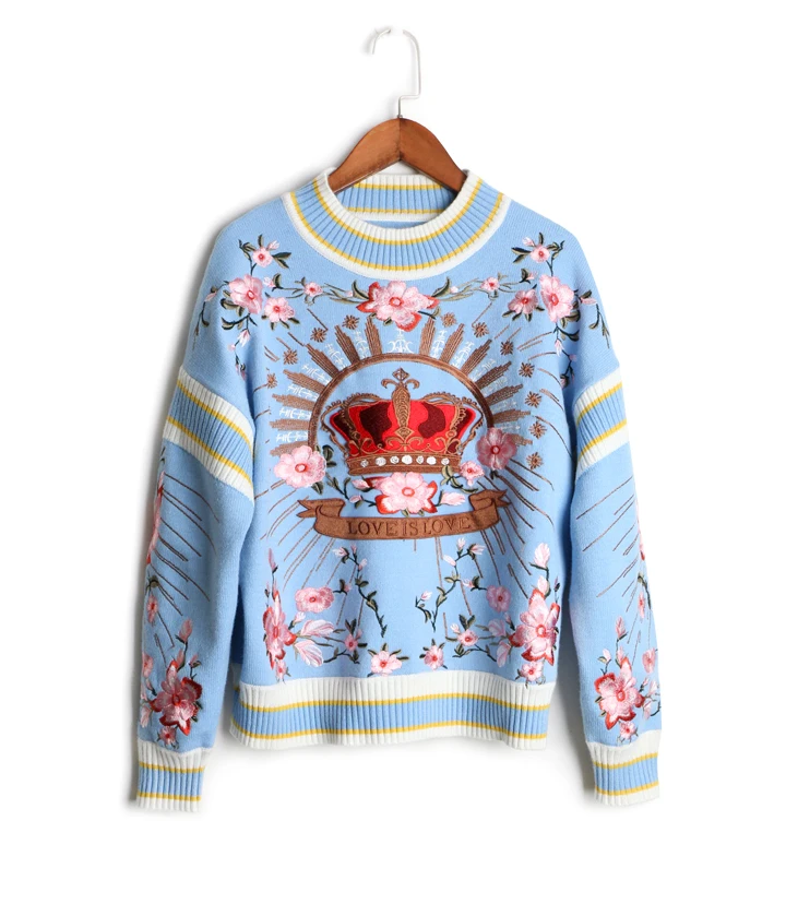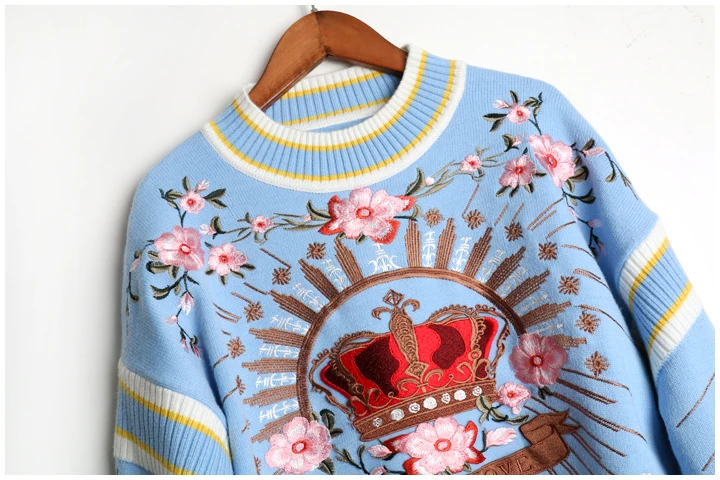 Svoryxiu 2018 Runway luxury Winter Knitting Pullovers Women’s High Quality Floral Crown Embroidery Casual Loose Blue Sweater