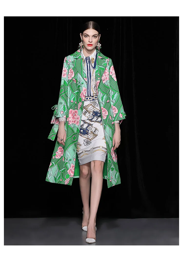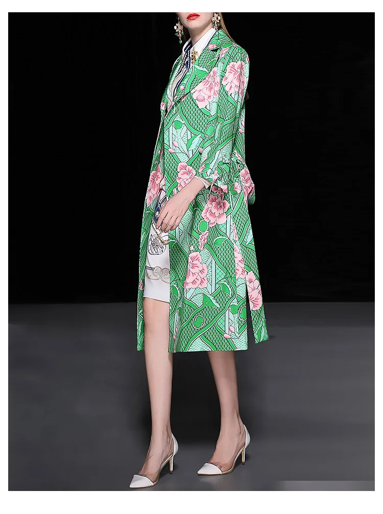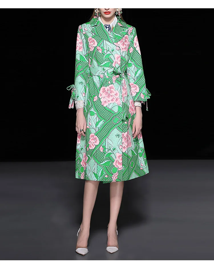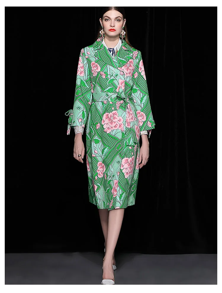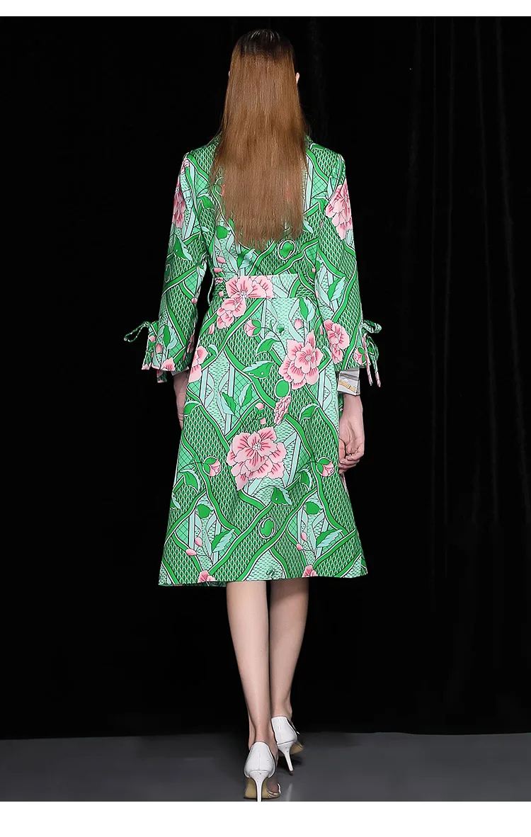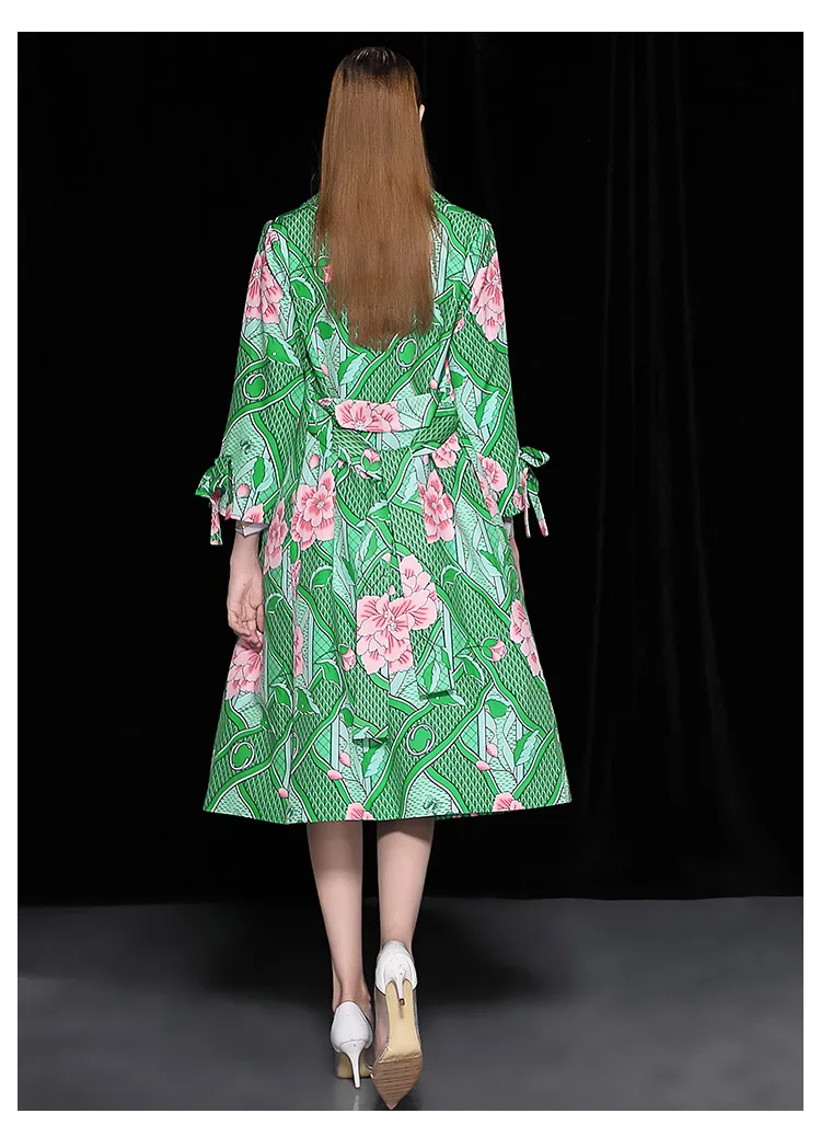Svoryxiu Designer Autumn Winter Long Trench Coat Women’s Bow Sleeve Floral Print Slim Double Breasted Green Outerwear Overcoat