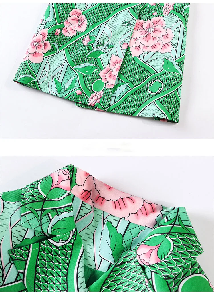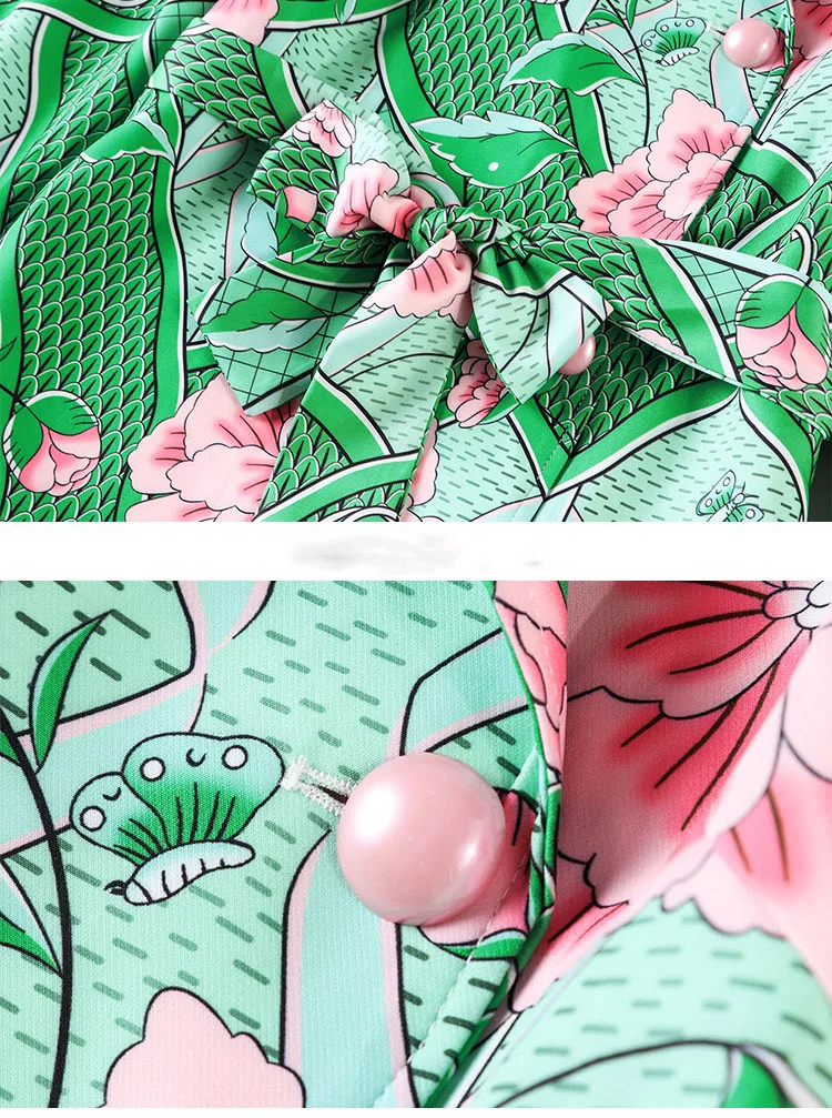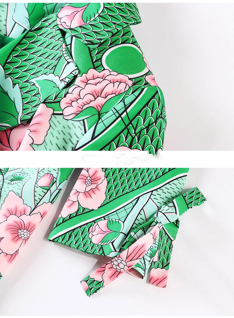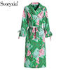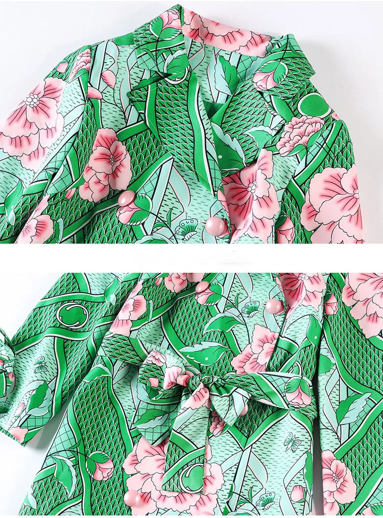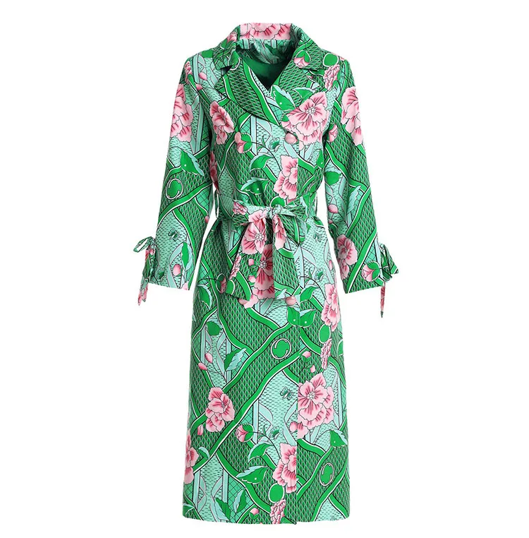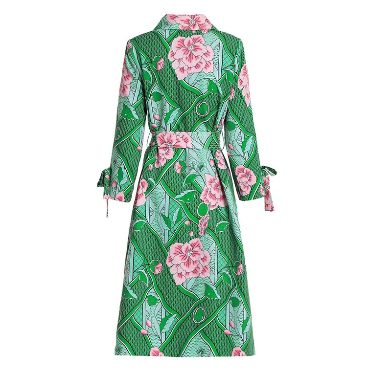 Svoryxiu Designer Autumn Winter Long Trench Coat Women’s Bow Sleeve Floral Print Slim Double Breasted Green Outerwear Overcoat