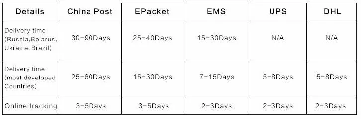 Packages from our warehouse in China will be shipped by ePacket or EMS depending on the weight and size of the product. Packages shipped from our US warehouse are shipped through USPS.