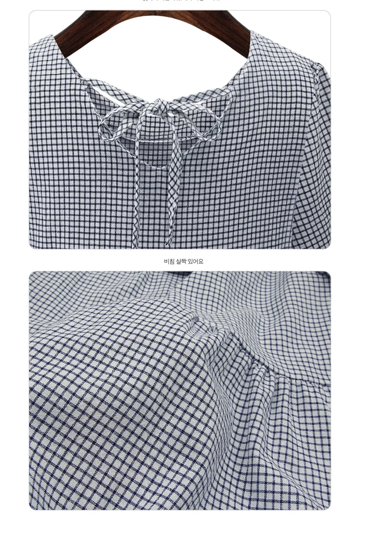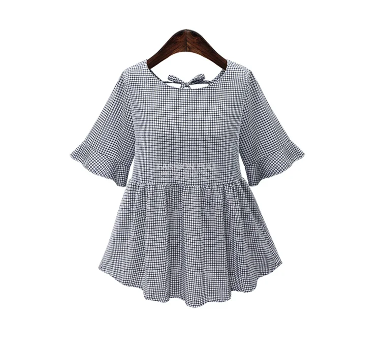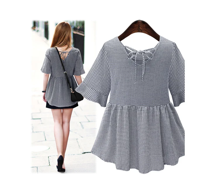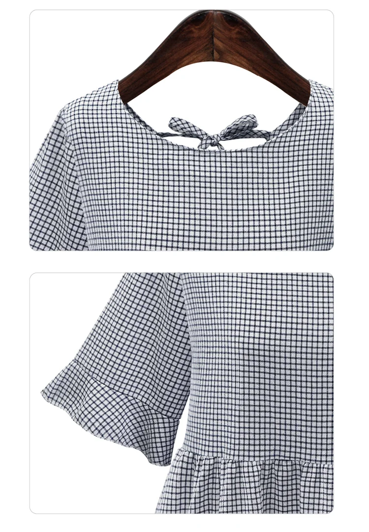Sweet Plaid Bow Back Blouses Women 2017 Summer Fashion Female Tops Short Sleeve Ruffles Blouses Shirts Women Blouses Hot T7N012A