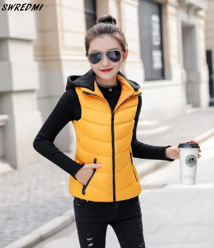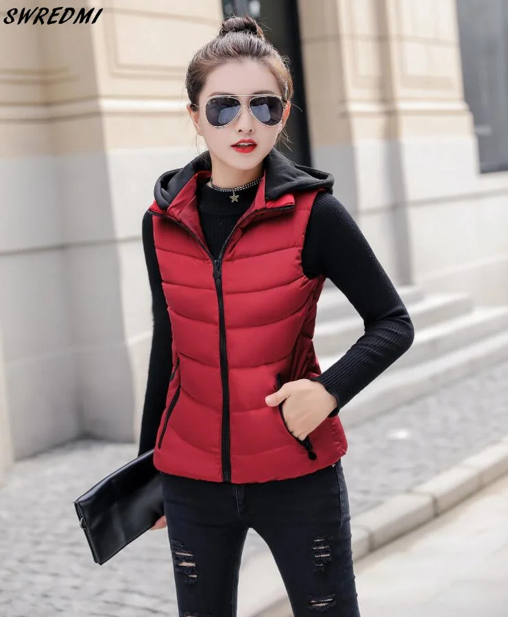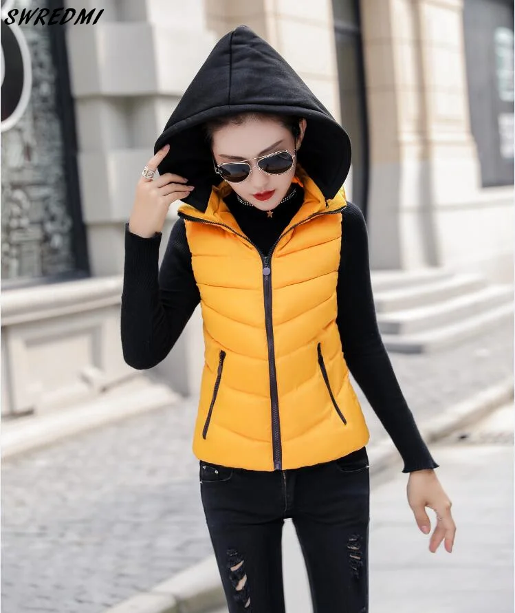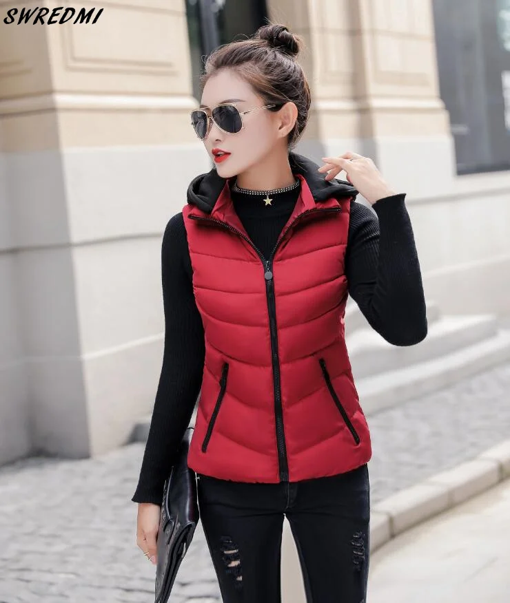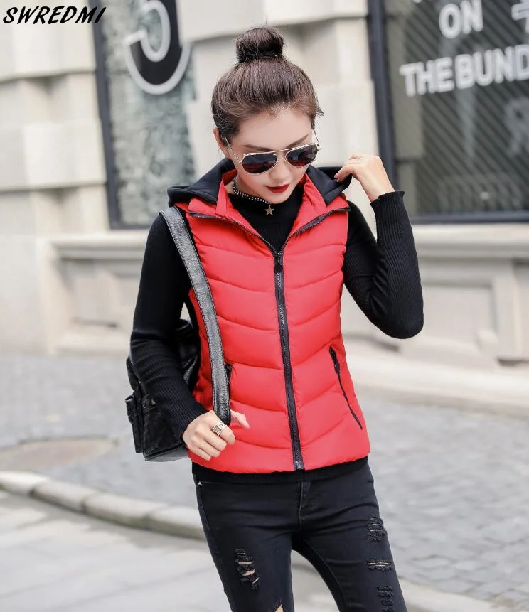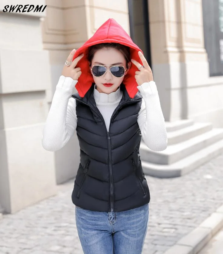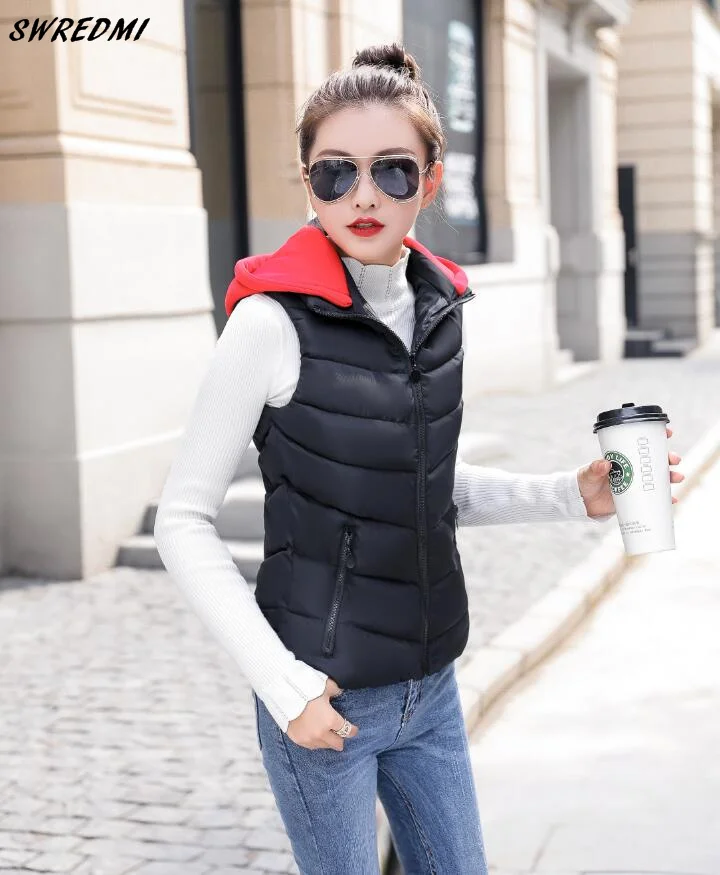 SWREDMI 2018 New Slim Casual Women Winter Vest Sleeveless Hooded Parka Down Cotton Vest Outerwear Plus Size 3XL Autumn Warm Vest