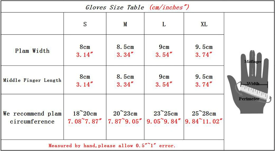 XL:Plam width 9.5cm (3.74″) Middle Finger 9.5cm Plam Circumference: 25~28cm(9.84″~11.02″)