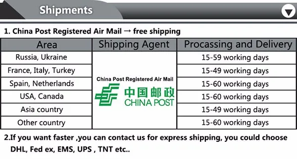 Packages from our warehouse in China will be shipped by ePacket or EMS depending on the weight and size of the product. Packages shipped from our US warehouse are shipped through USPS.
