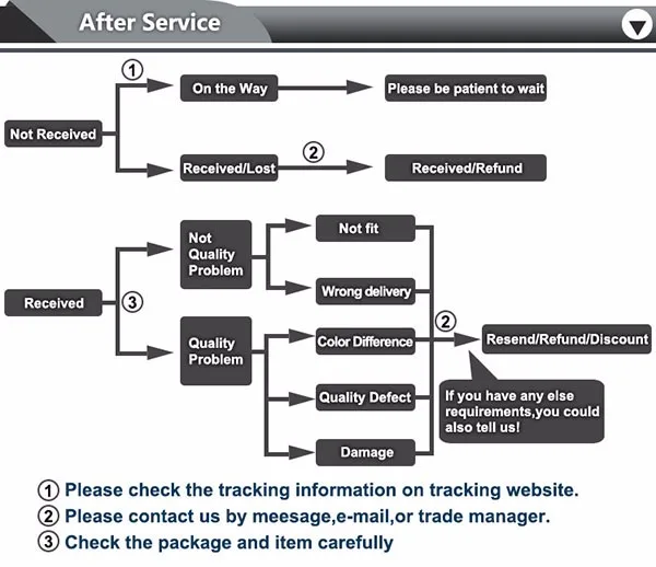 • If you did not receive the product within the guaranteed time( 45 days not including 2-5 day processing) you can request a refund or a reshipment.