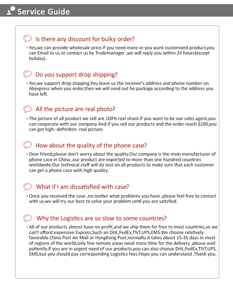 • If you did not receive the product within the guaranteed time( 45 days not including 2-5 day processing) you can request a refund or a reshipment.
