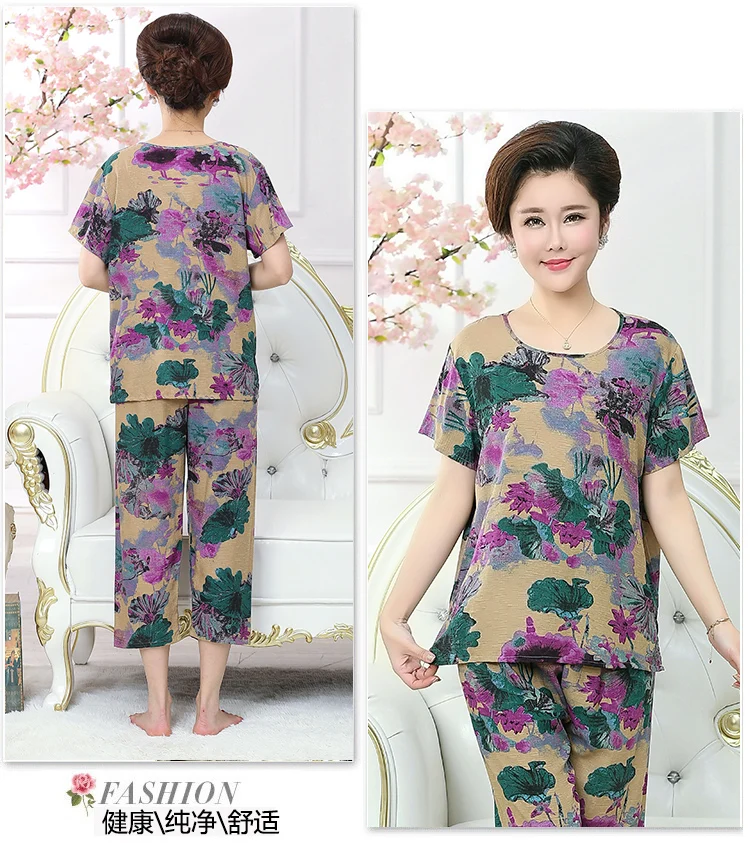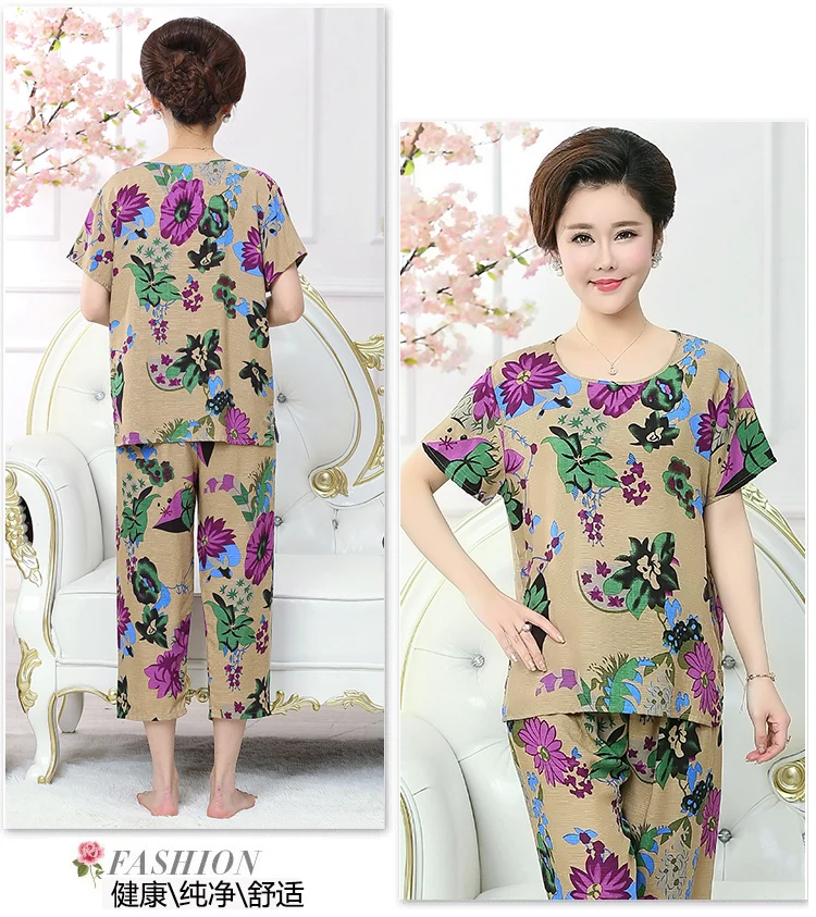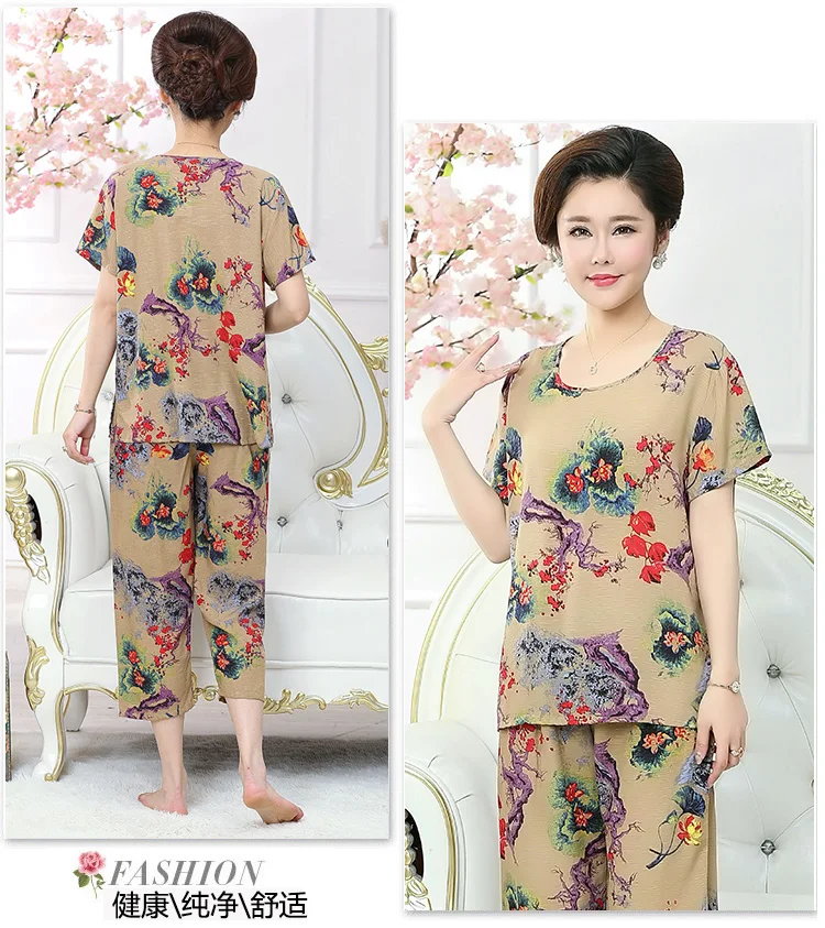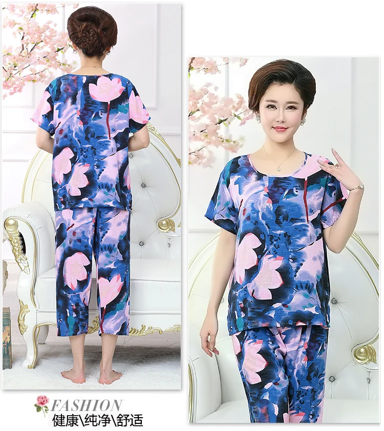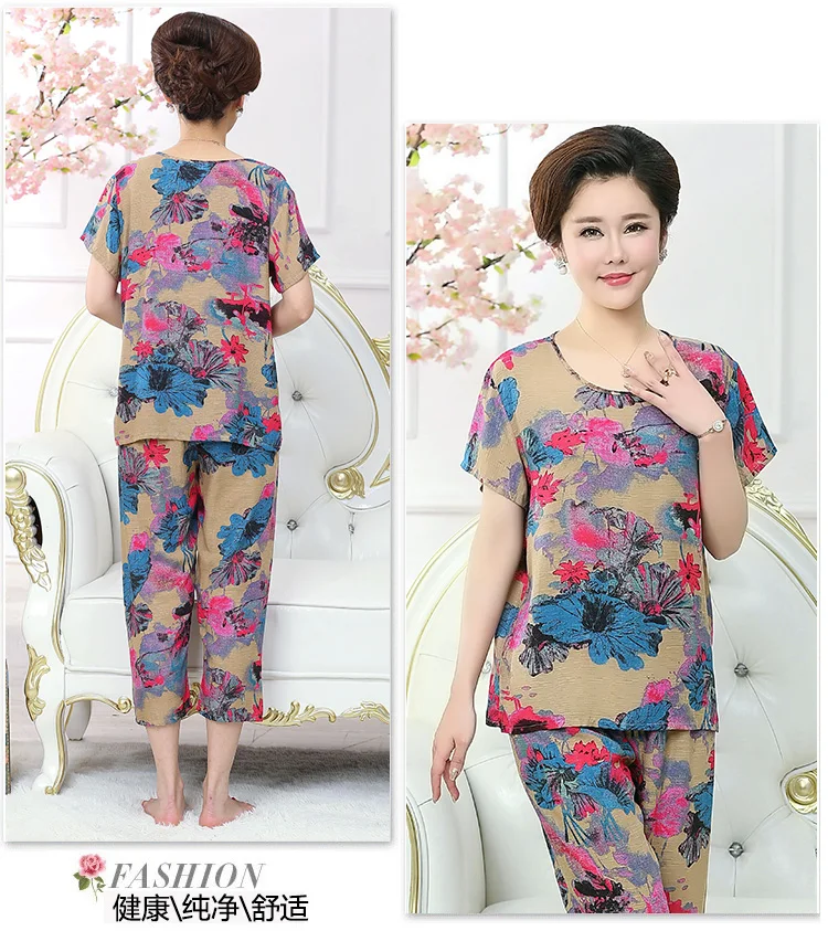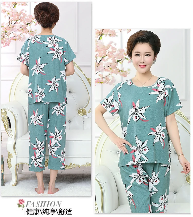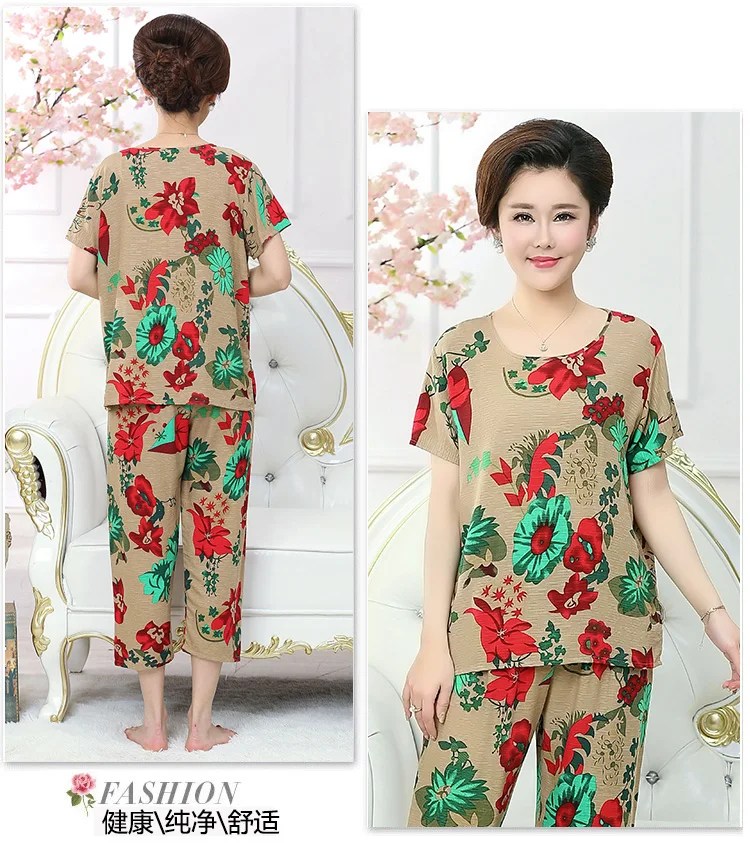 Thoshine Brand Summer 100% Cotton Women Pajamas Sets Floral Print Sleepwear O-Neck Female Calf Length Pants Outerwear Clothing