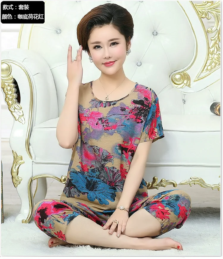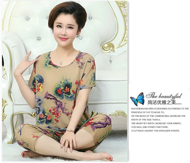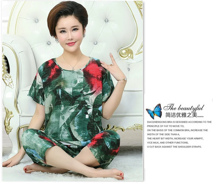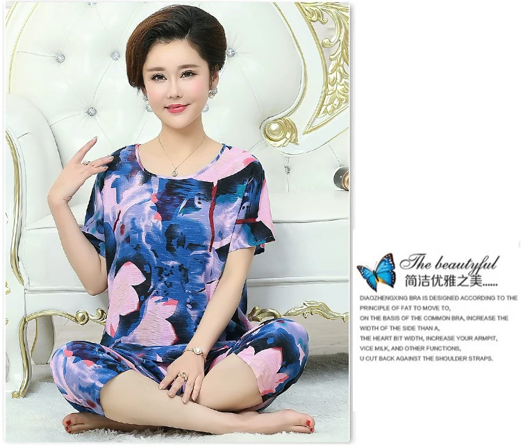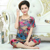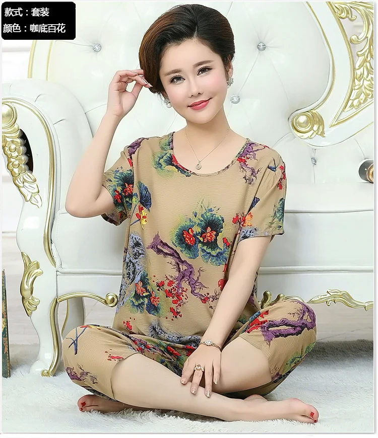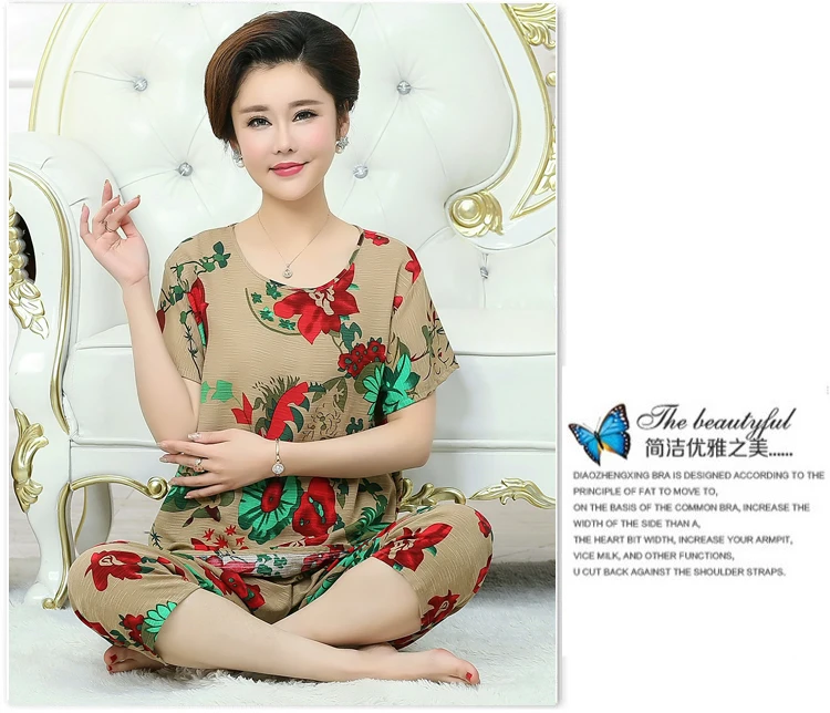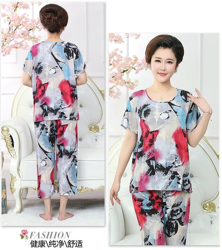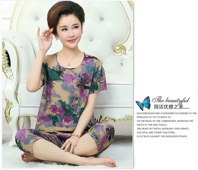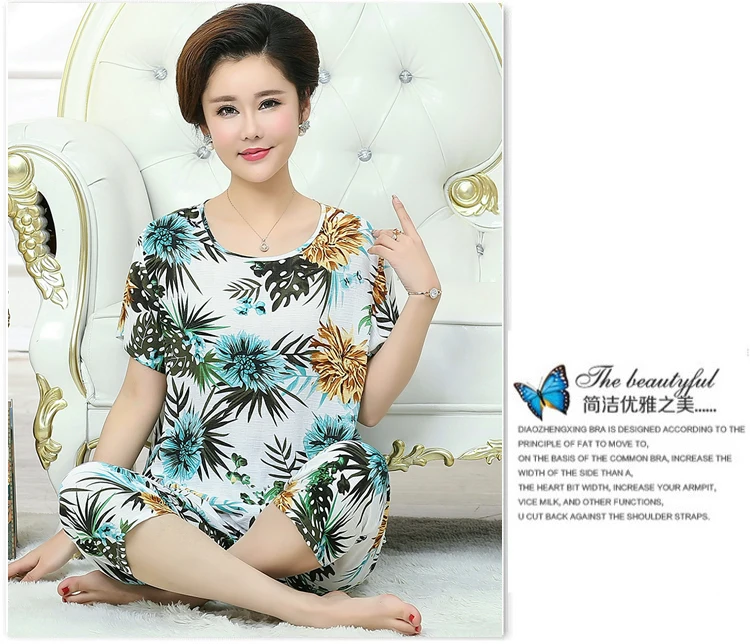 Thoshine Brand Summer 100% Cotton Women Pajamas Sets Floral Print Sleepwear O-Neck Female Calf Length Pants Outerwear Clothing